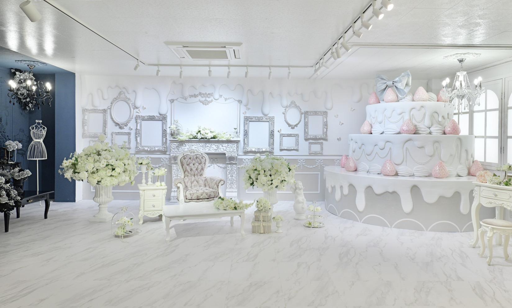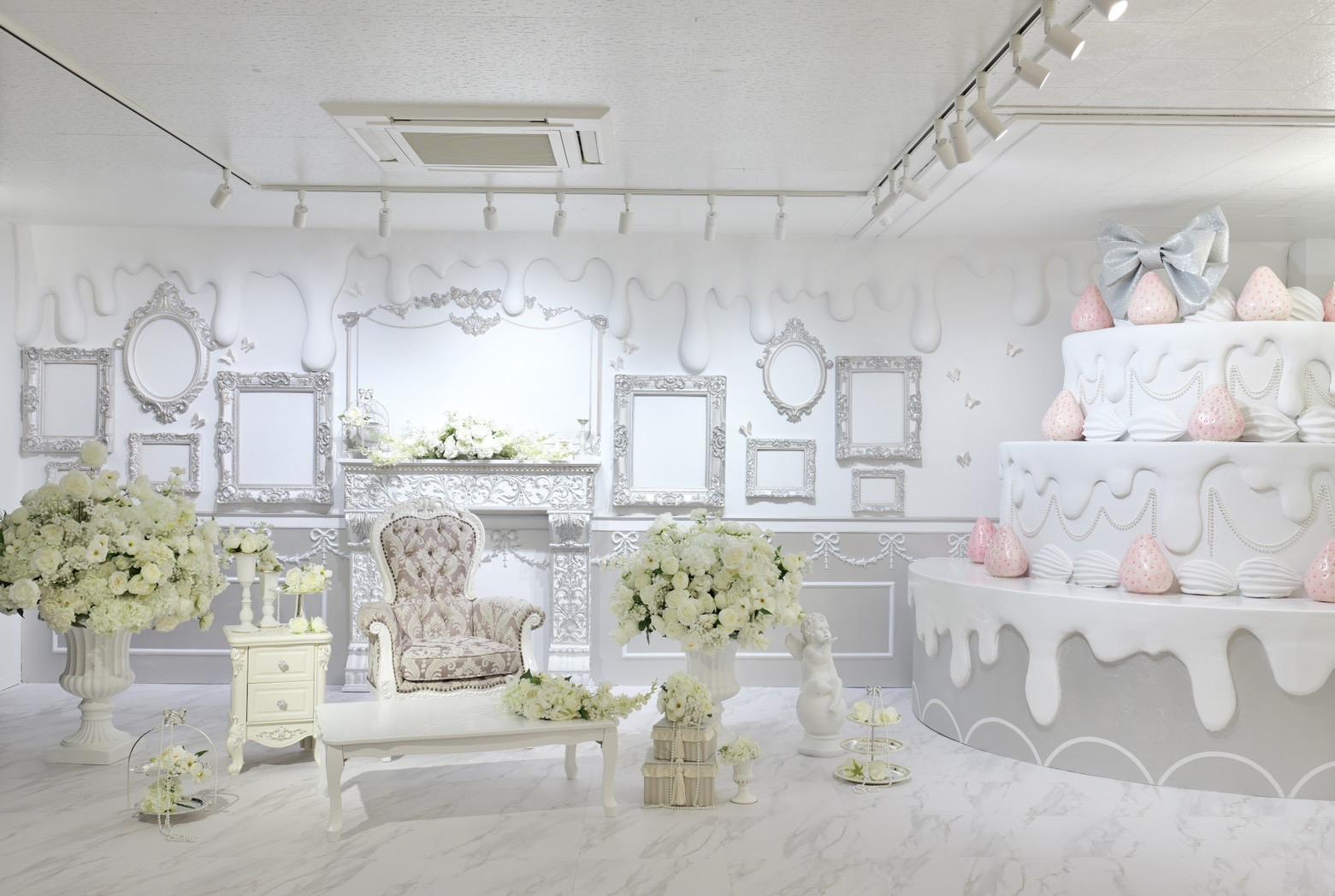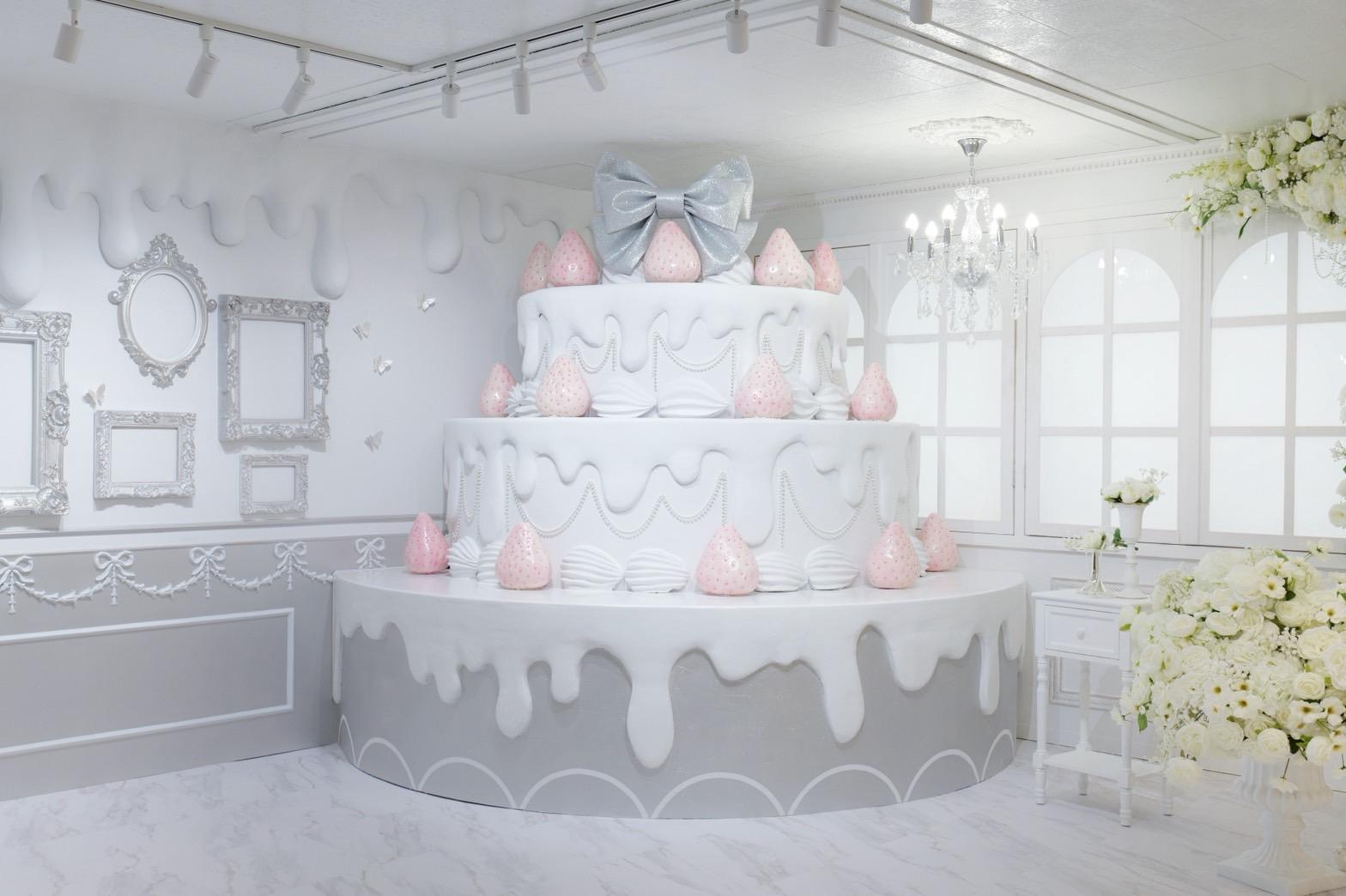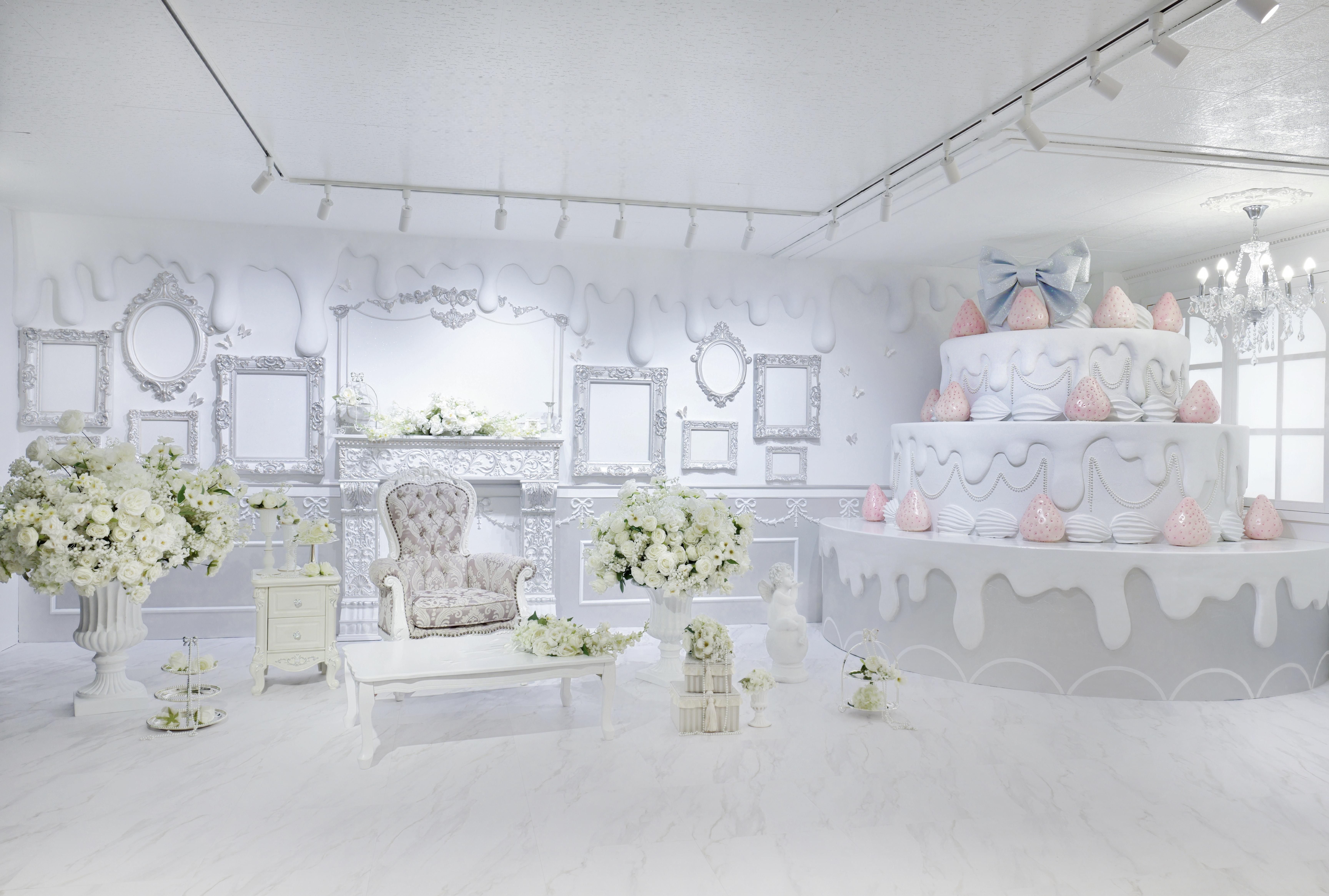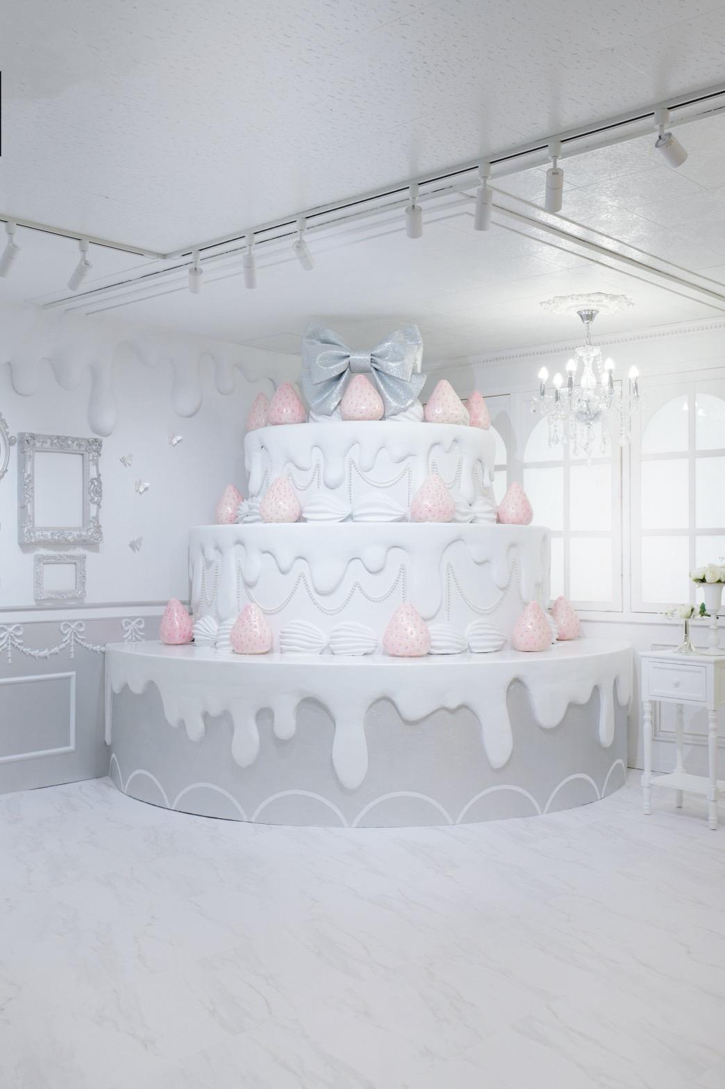 巨大ケーキをメインとしたホワイト×シルバーの背景を活かして世界観を自由にカスタマイズ♡