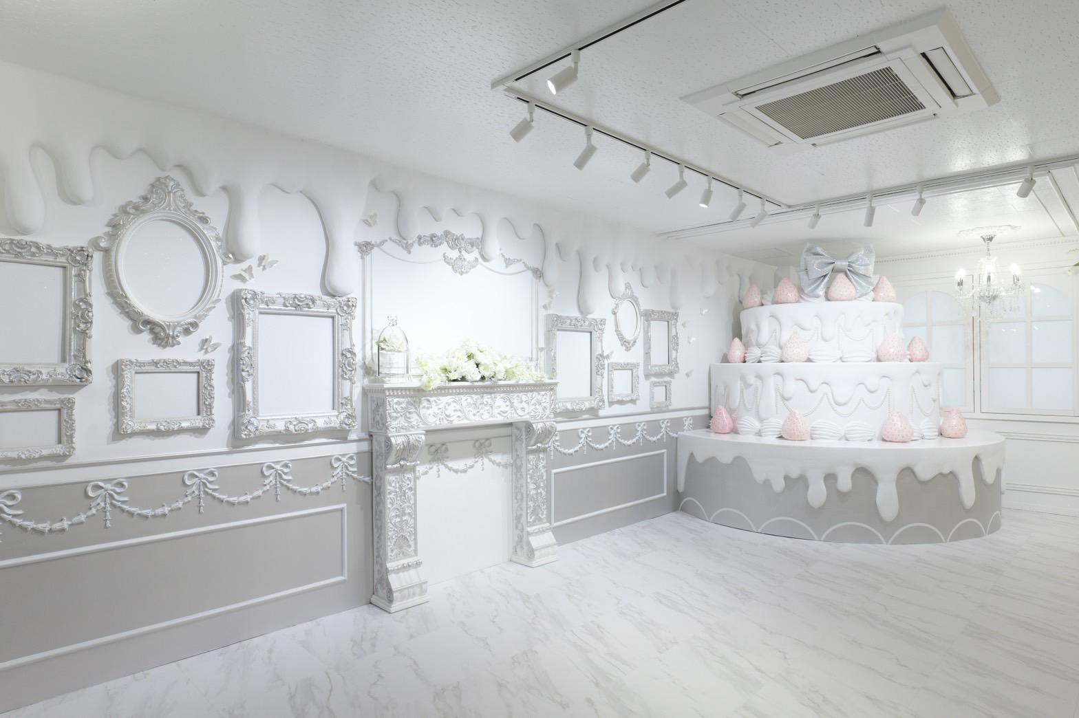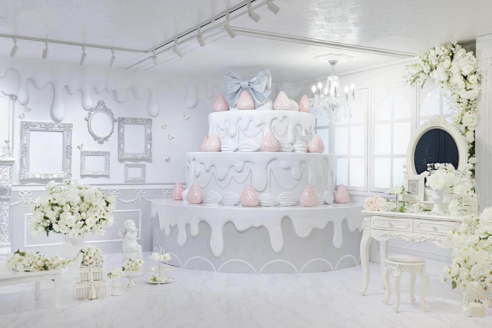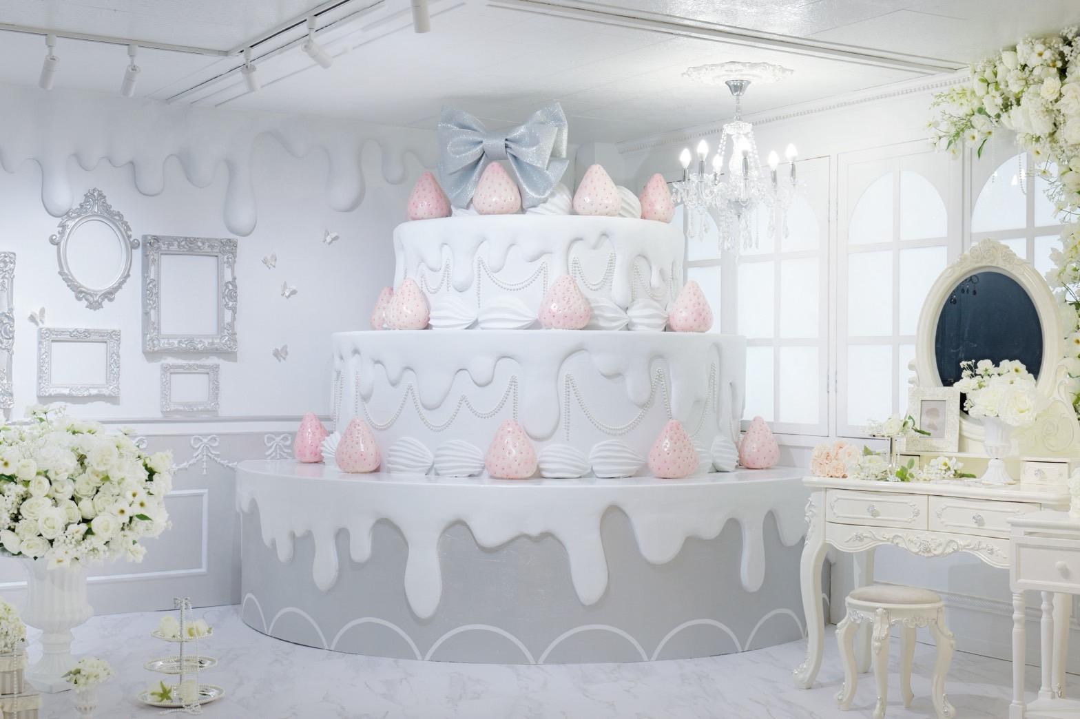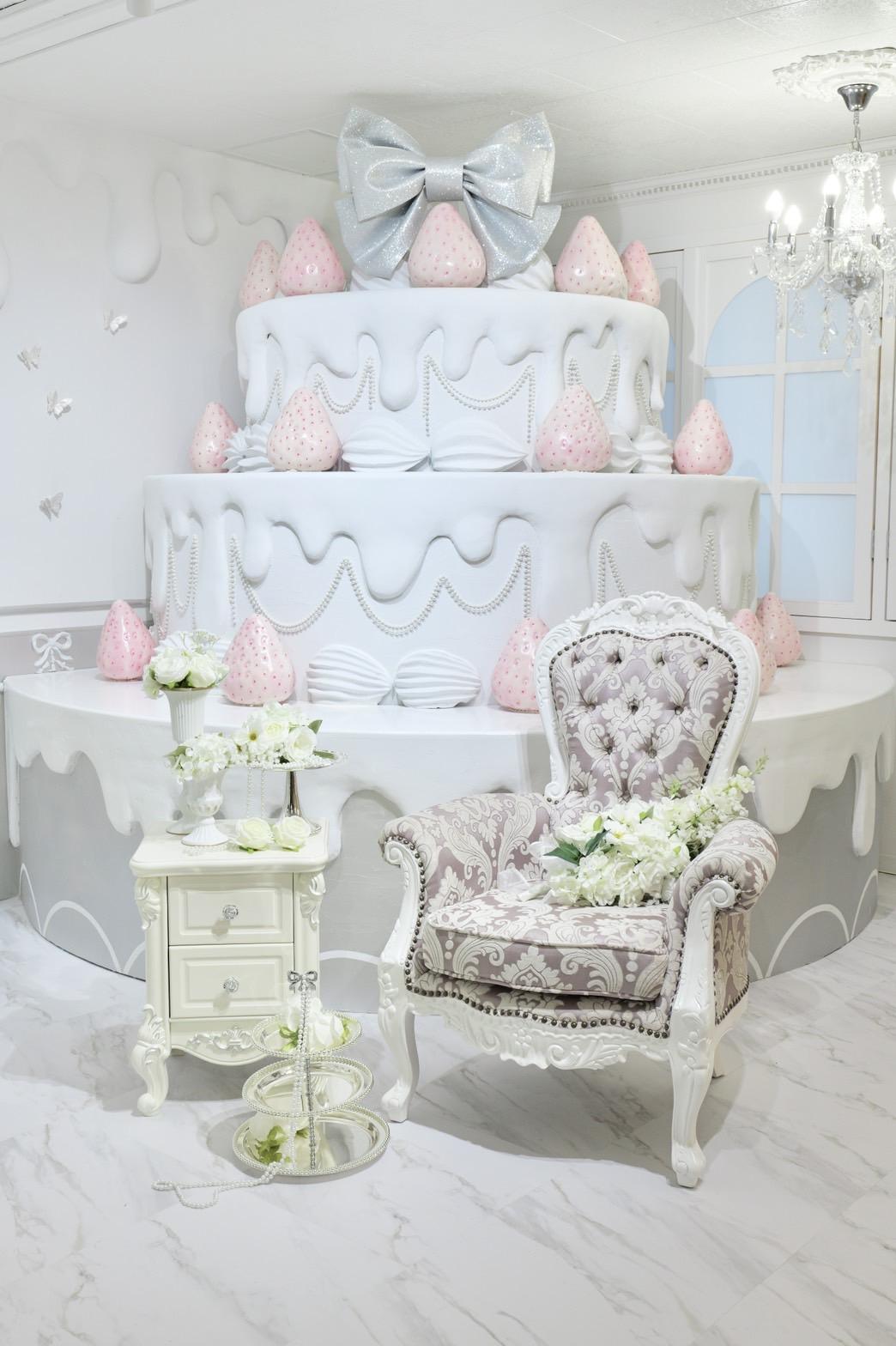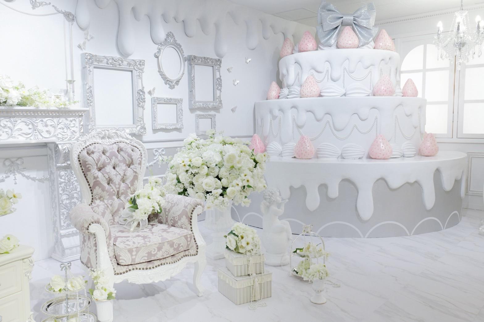 巨大ケーキをメインとしたホワイト×シルバーの背景を活かして世界観を自由にカスタマイズ♡