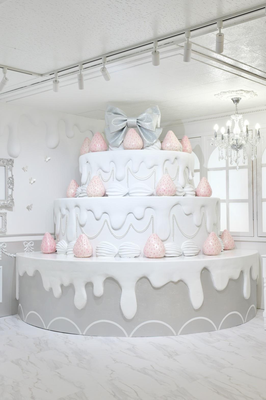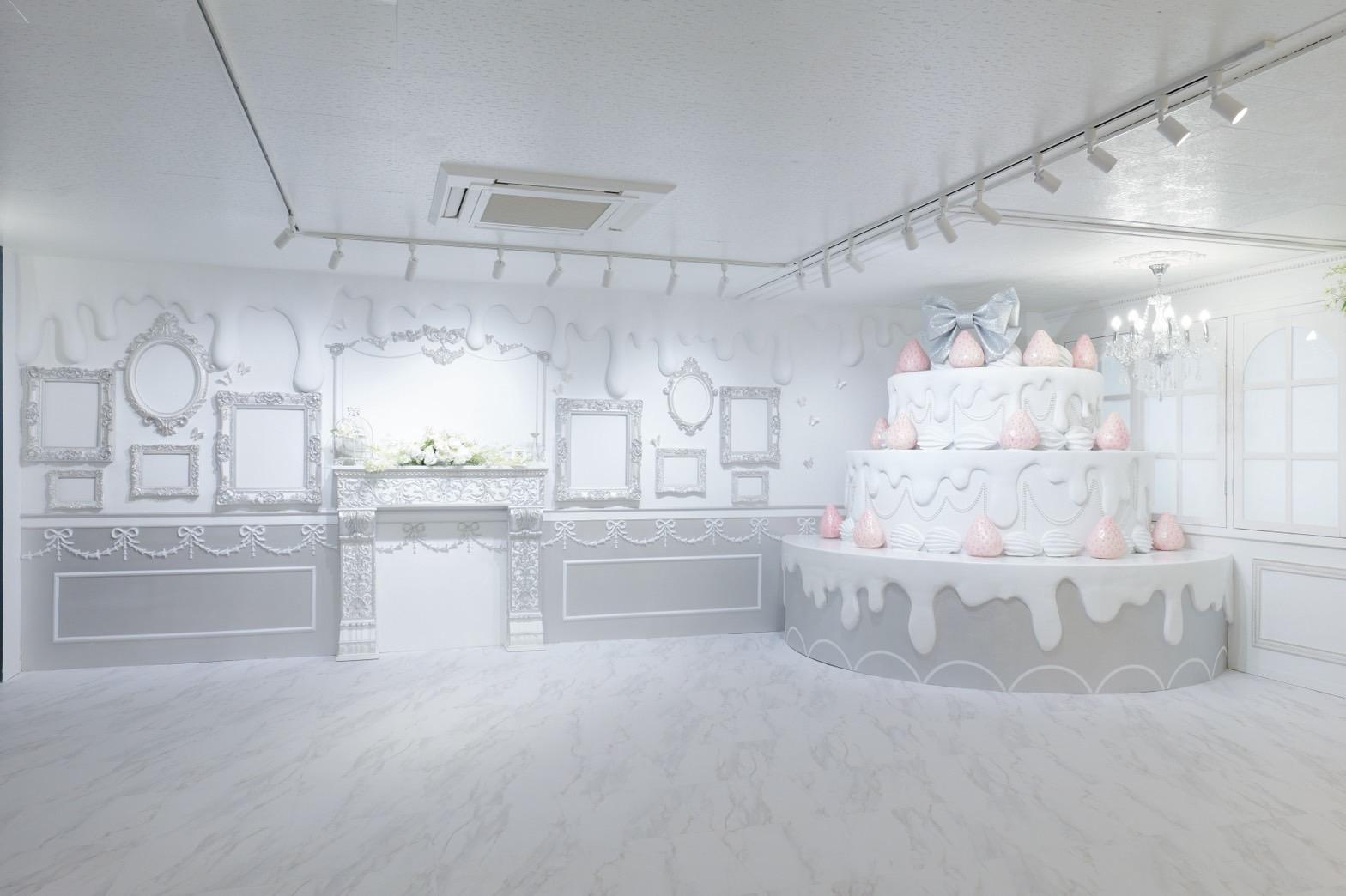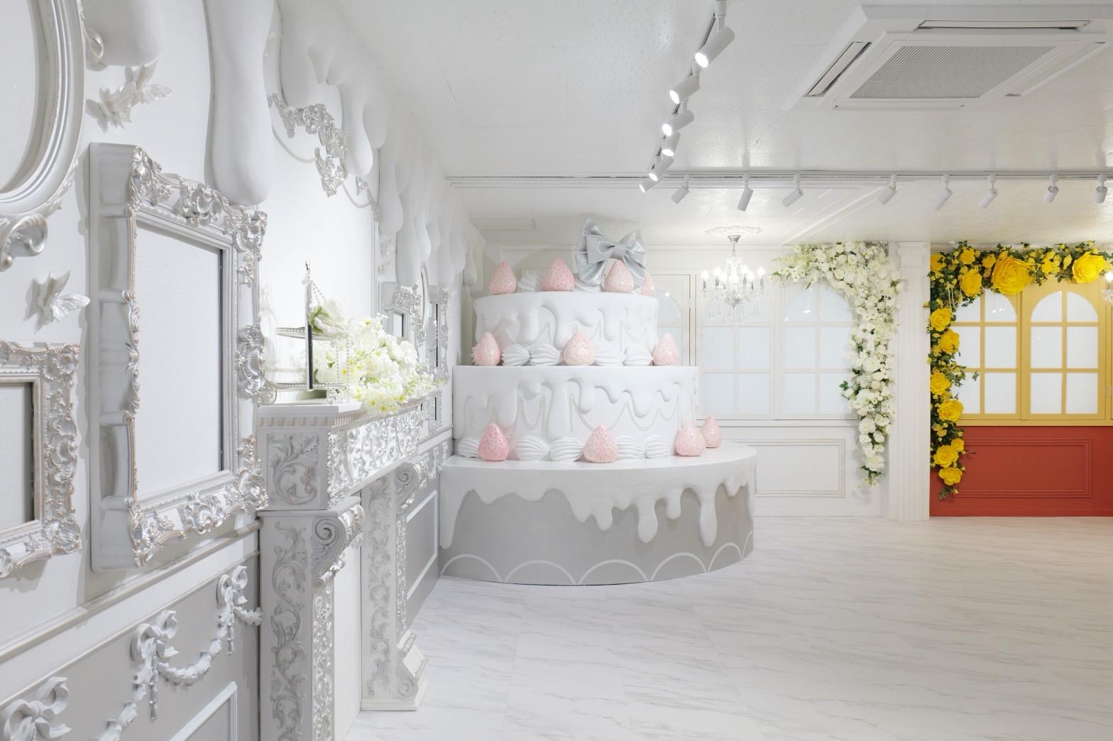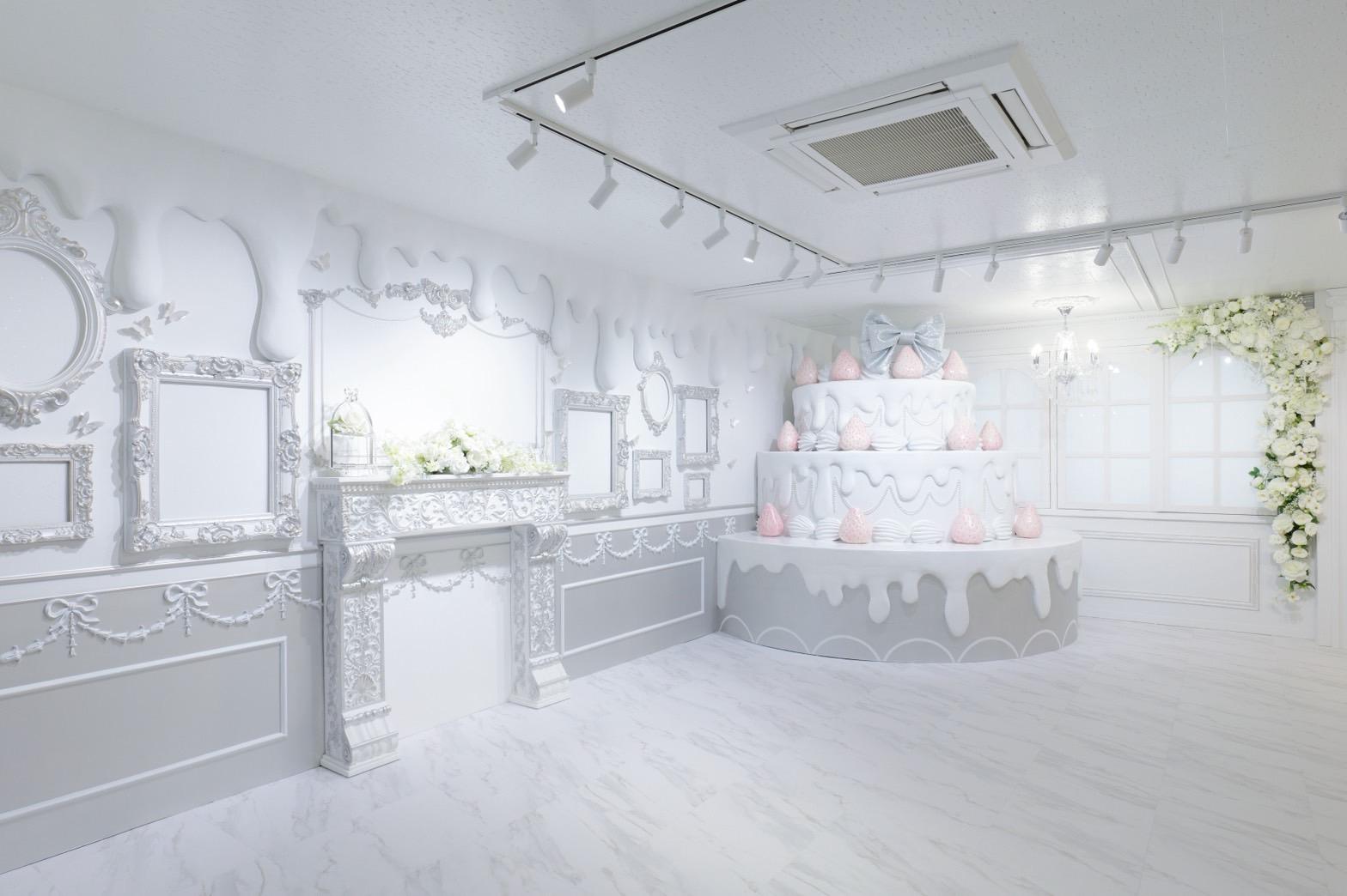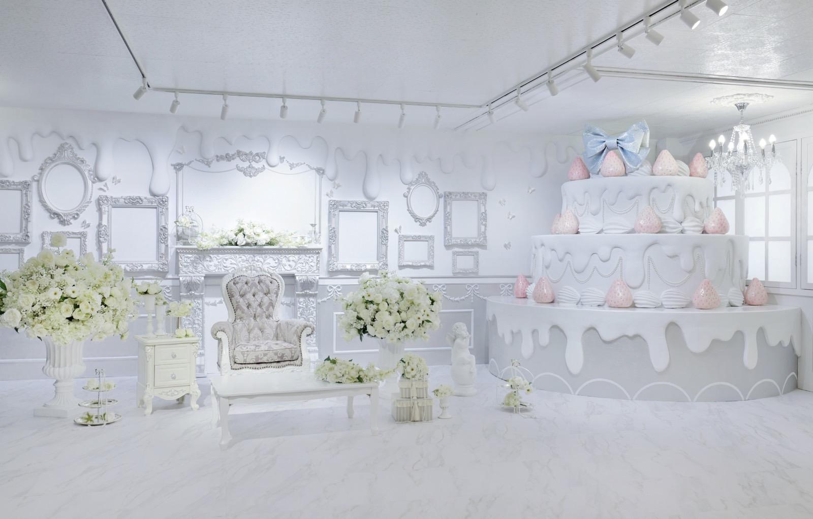 巨大ケーキをメインとしたホワイト×シルバーの背景を活かして世界観を自由にカスタマイズ♡
