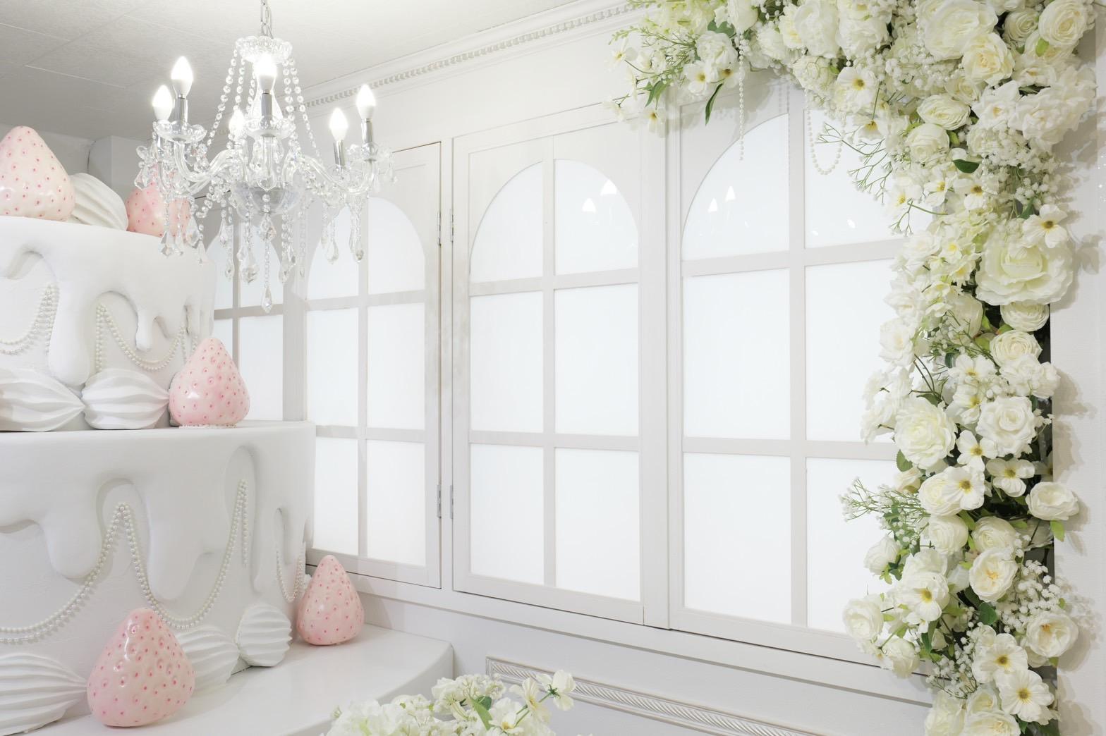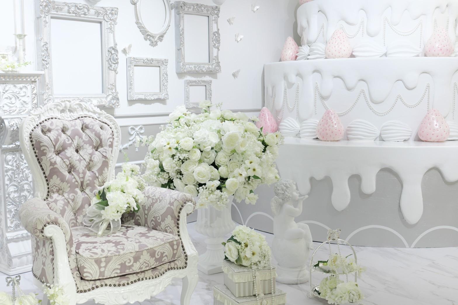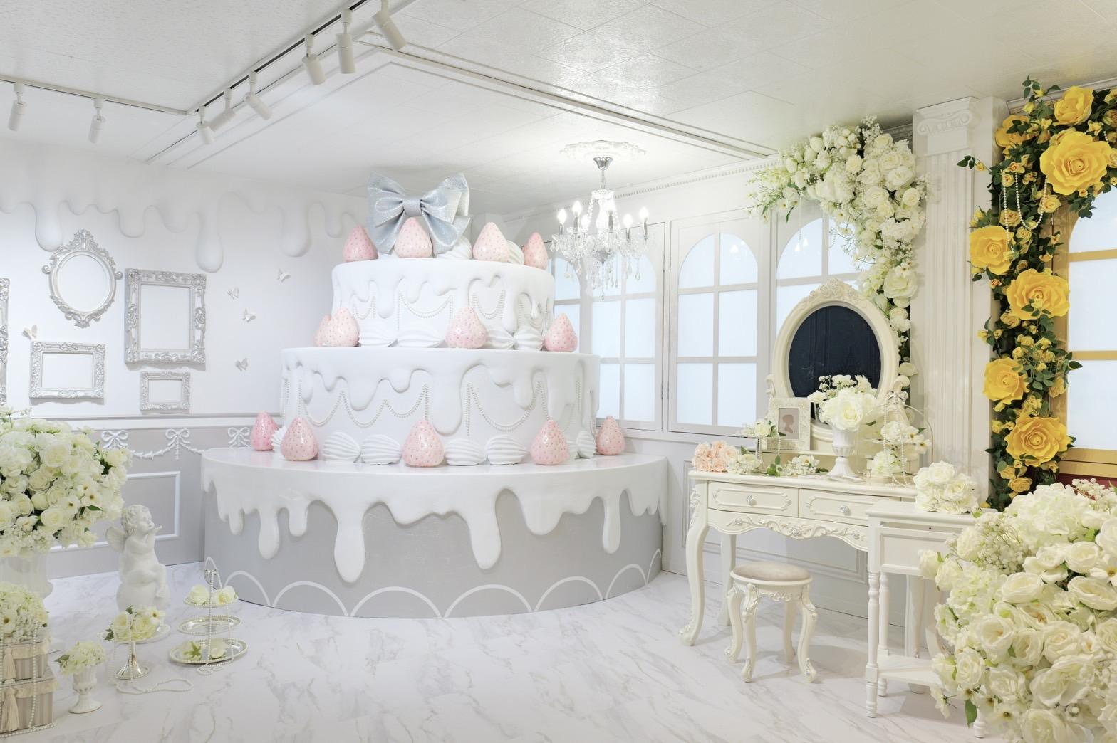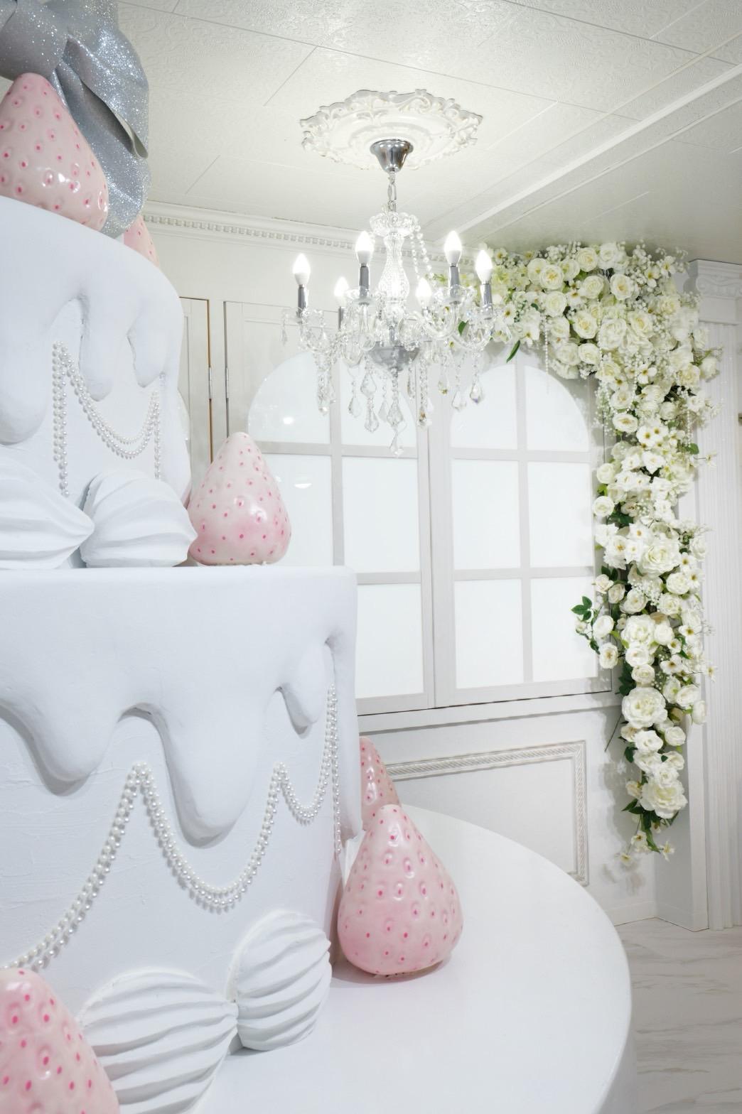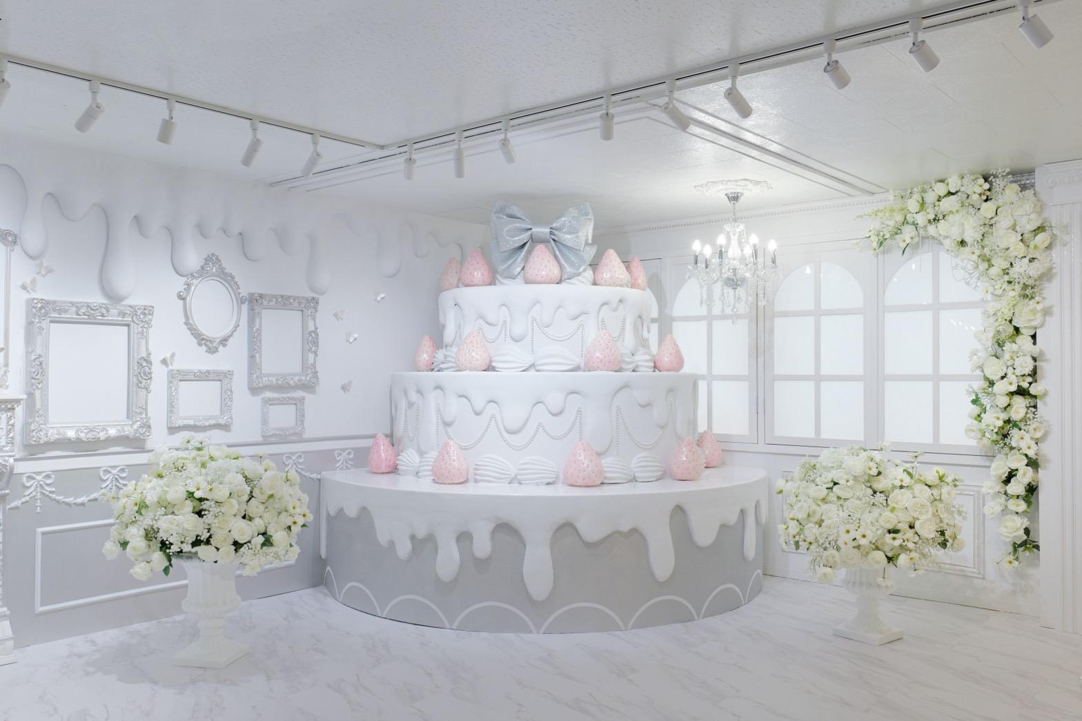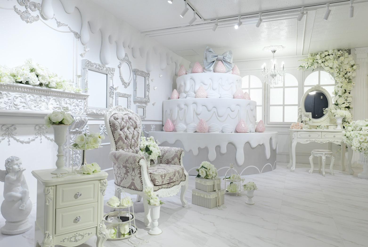 巨大ケーキをメインとしたホワイト×シルバーの背景を活かして世界観を自由にカスタマイズ♡