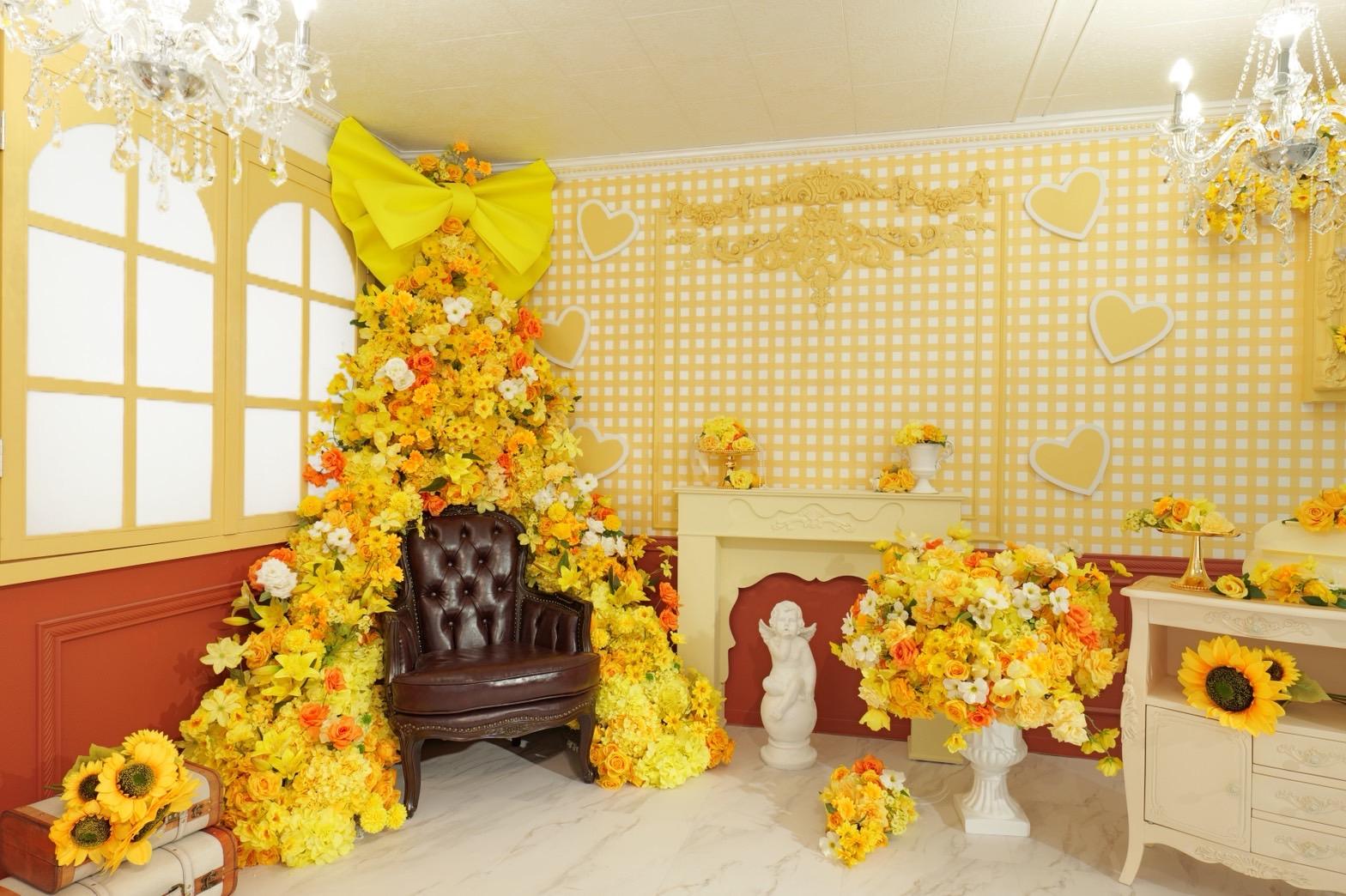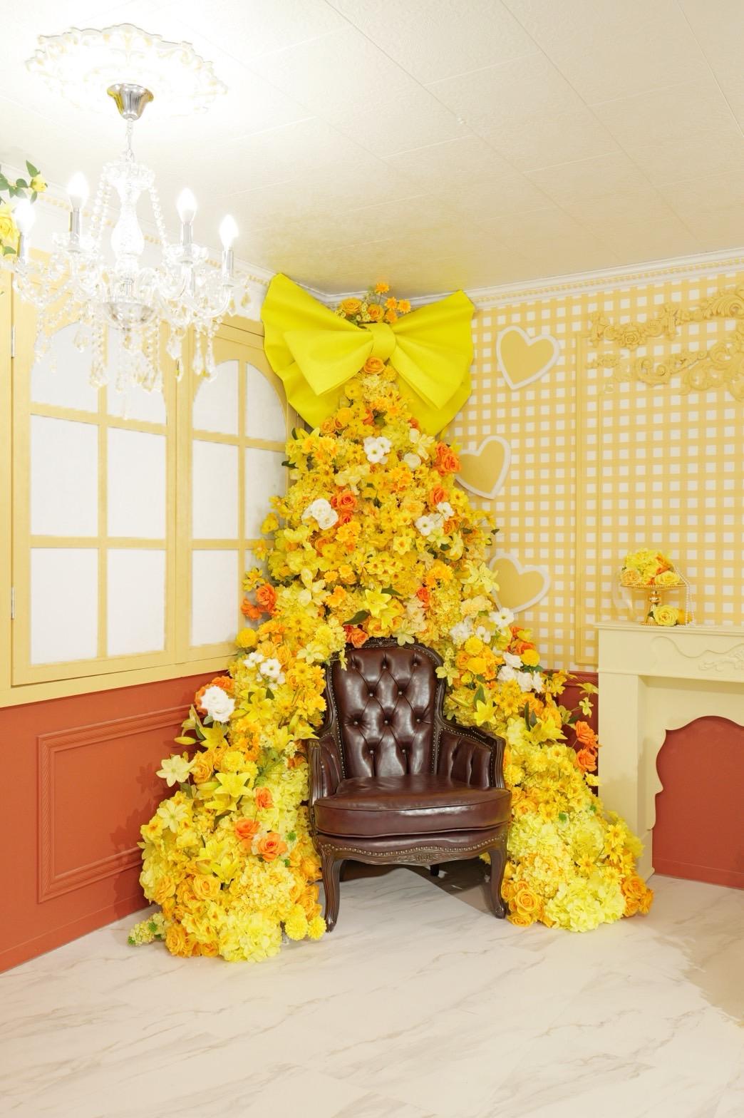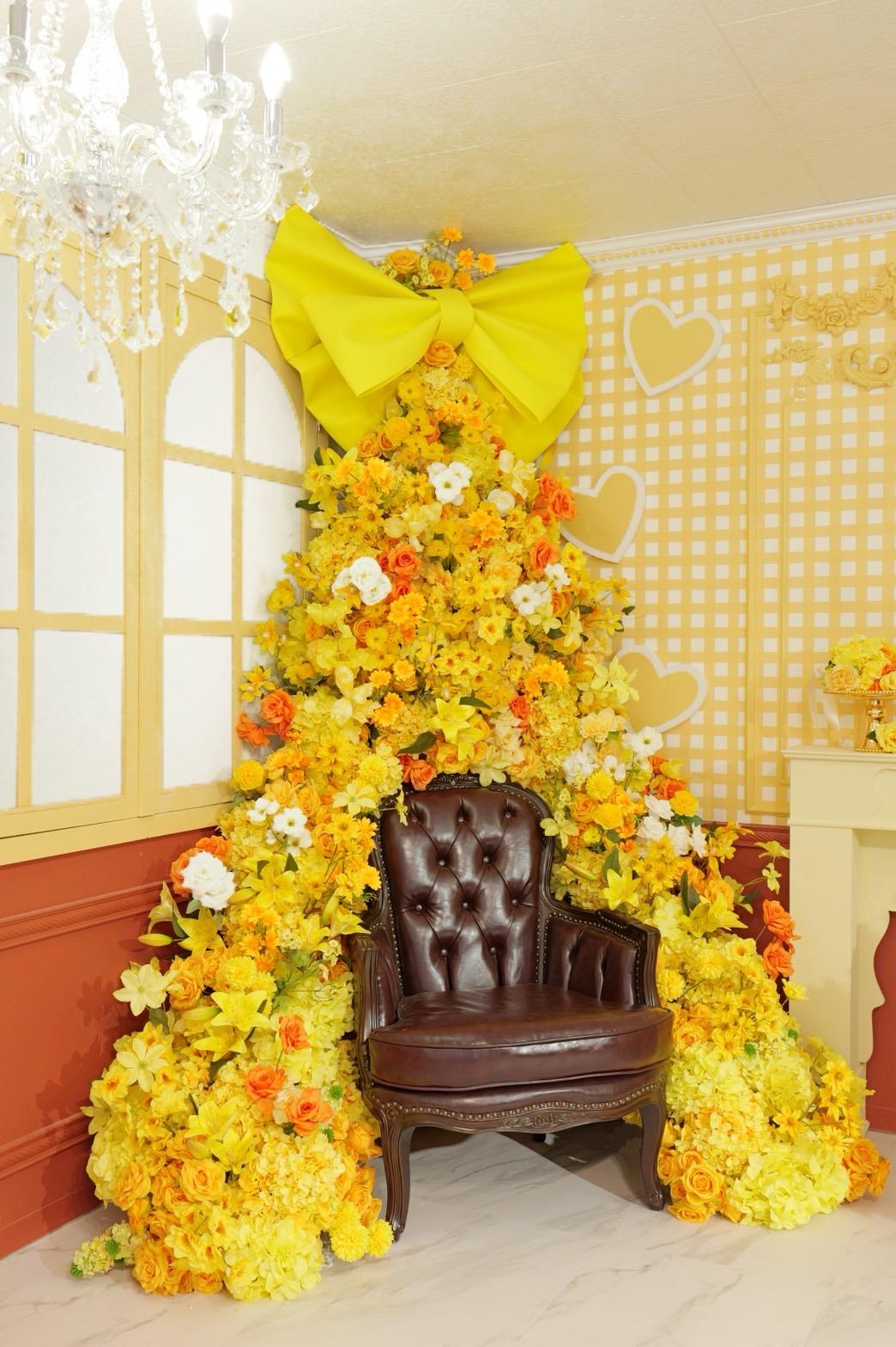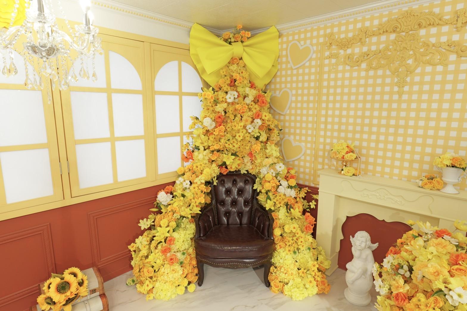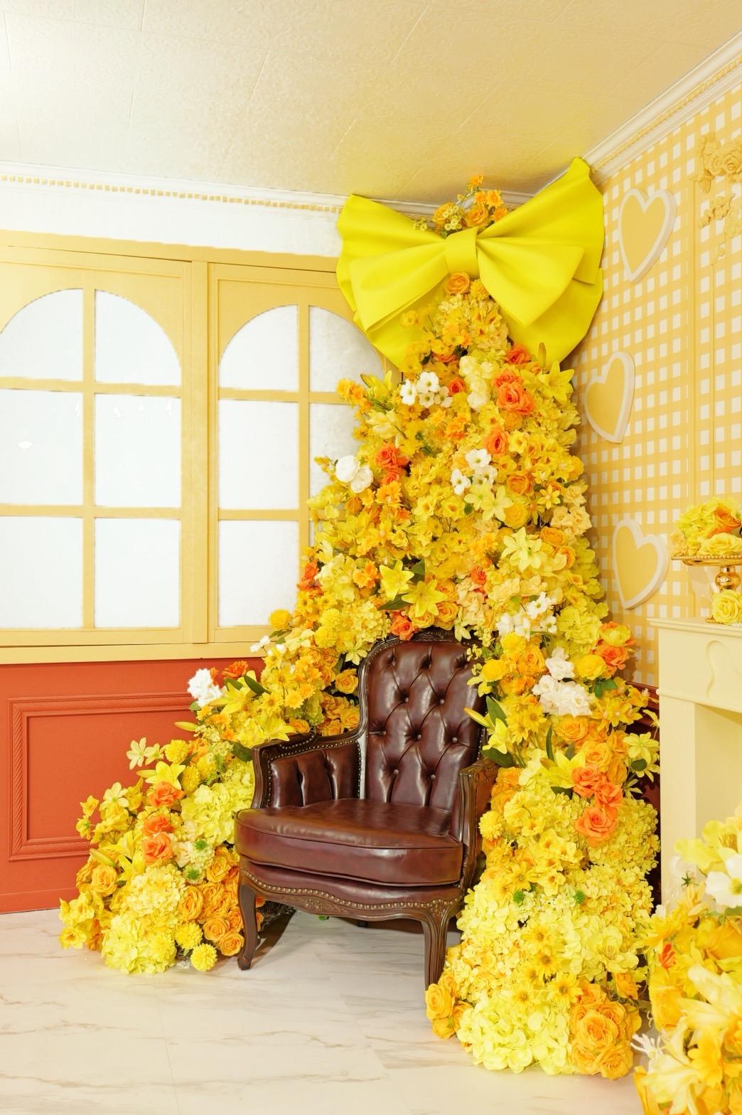 オレンジ×イエローの花々に包まれた華やかなブース。大きなリボンと豪華な花々が壁一面を飾り、存在感のあるチェアとロココ調家具が並ぶ華やかな空間です。“可愛い撮影スタジオ”を探している方にぴったり