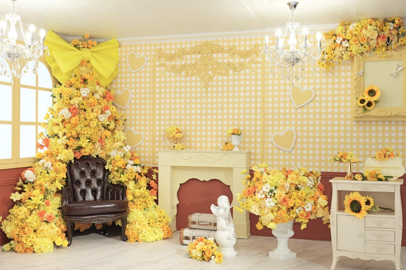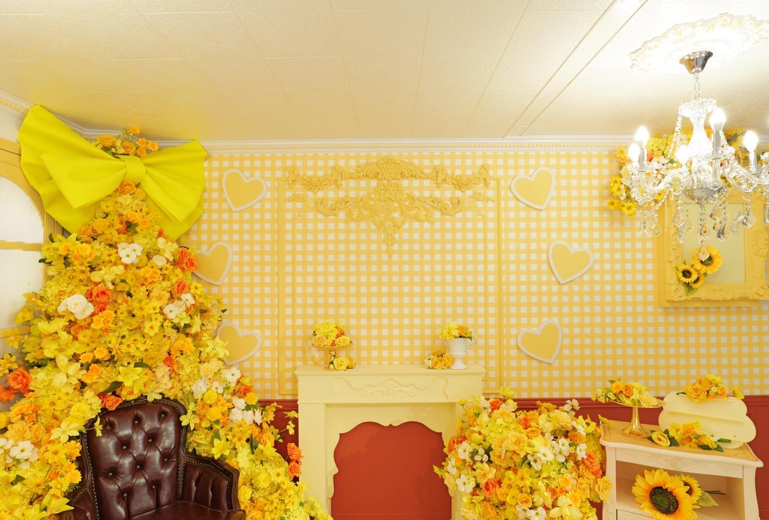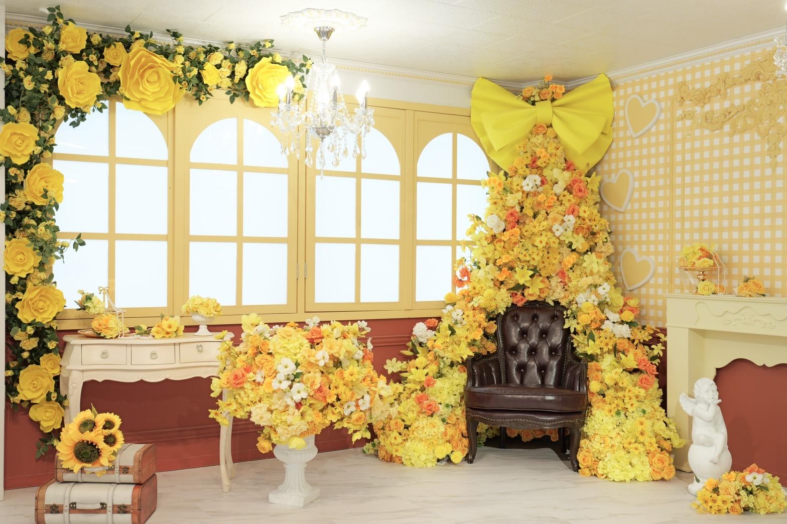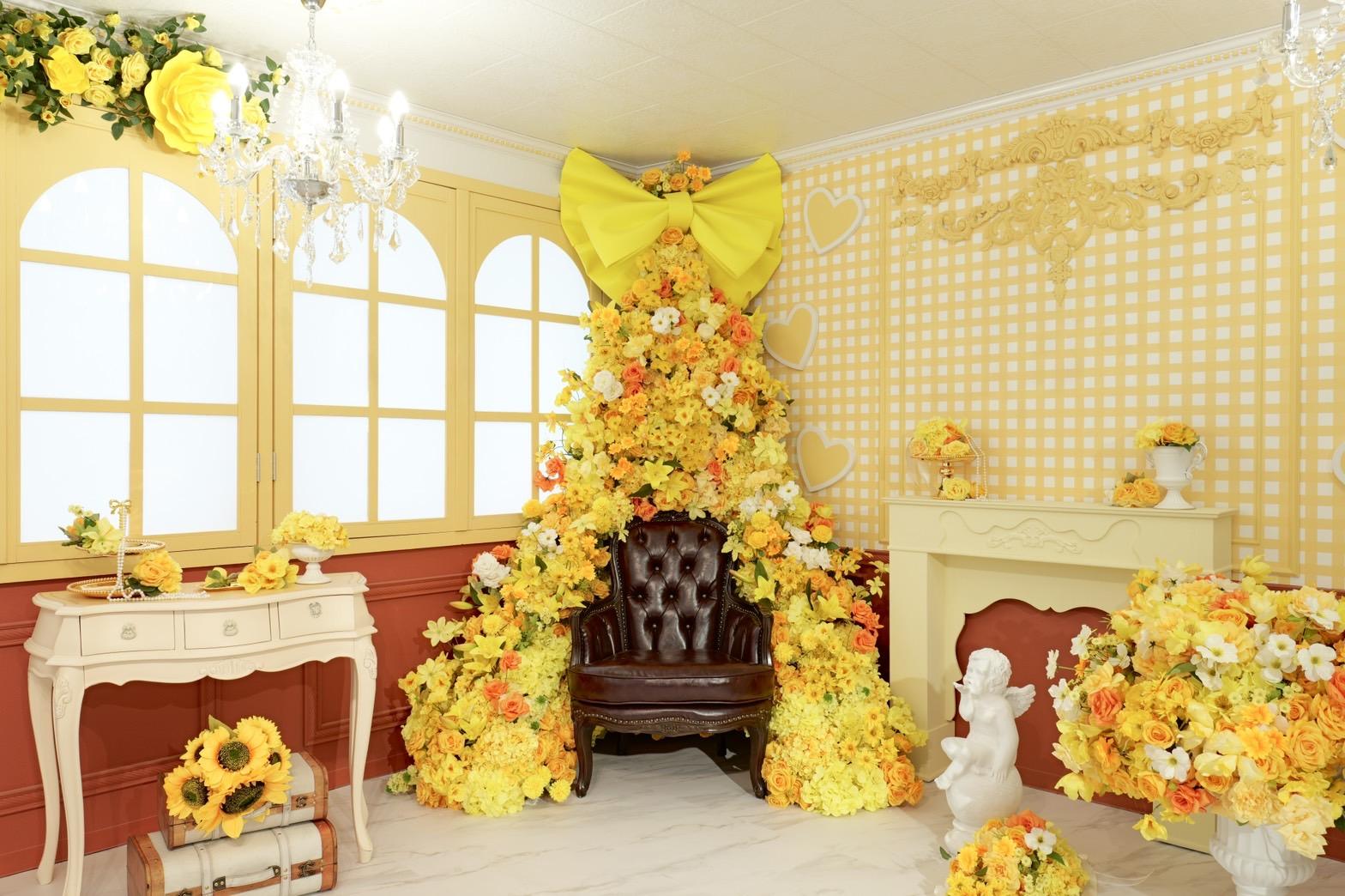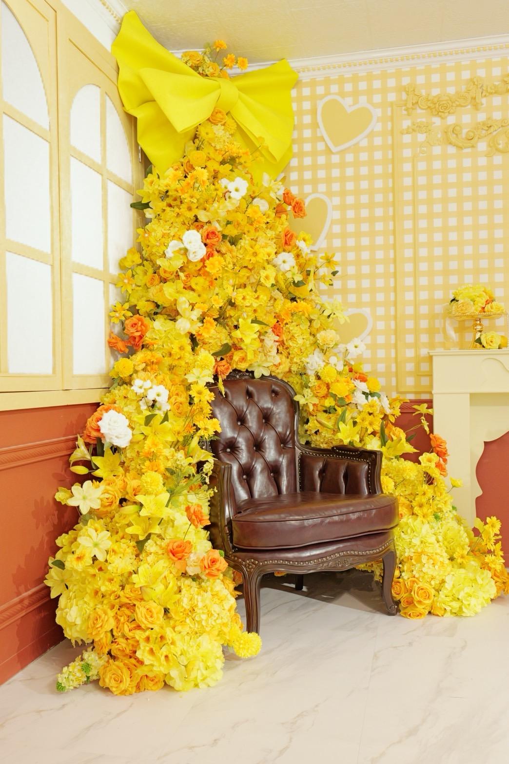 オレンジ×イエローの花々に包まれた華やかなブース。大きなリボンと豪華な花々が壁一面を飾り、存在感のあるチェアとロココ調家具が並ぶ華やかな空間です。“可愛い撮影スタジオ”を探している方にぴったり