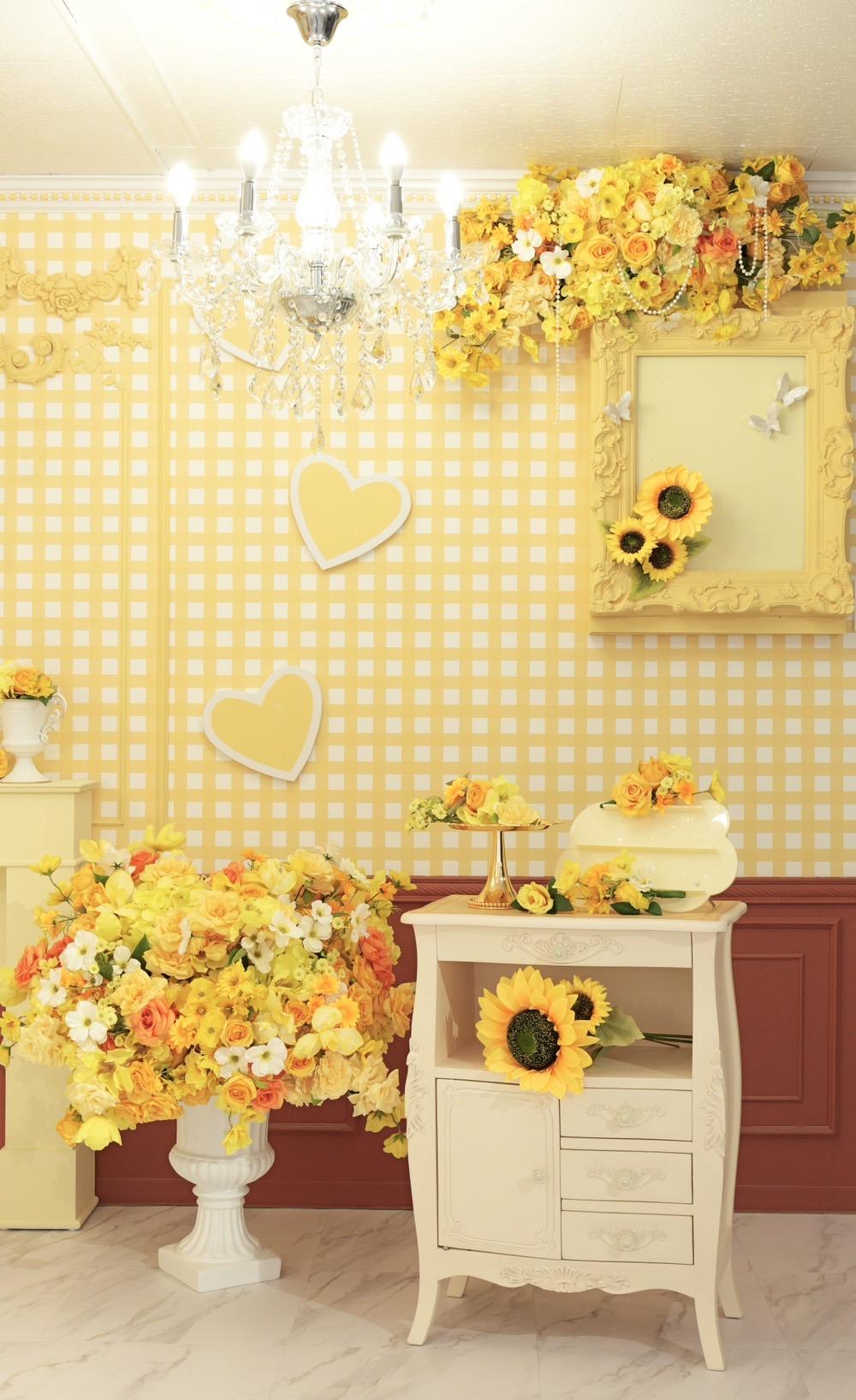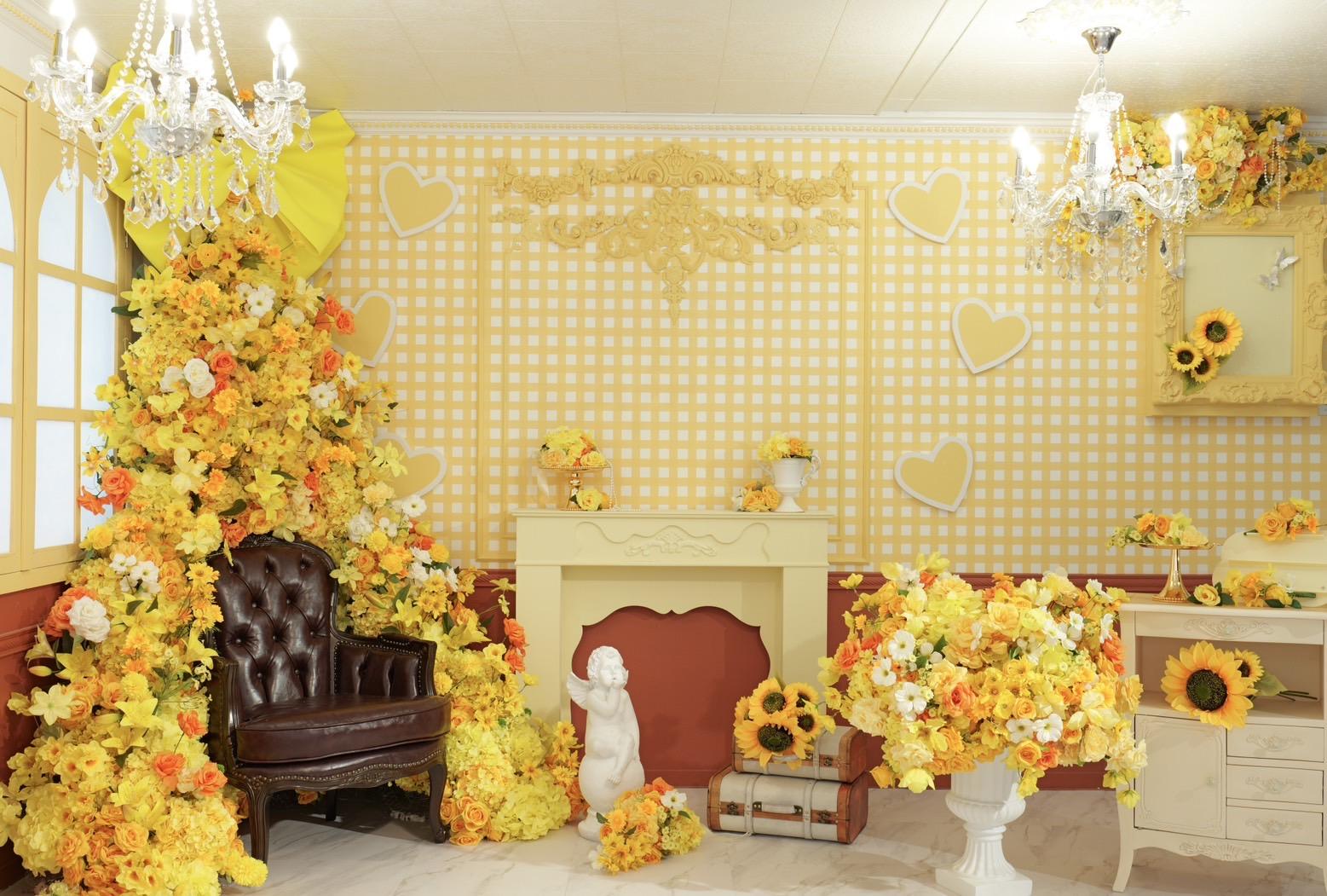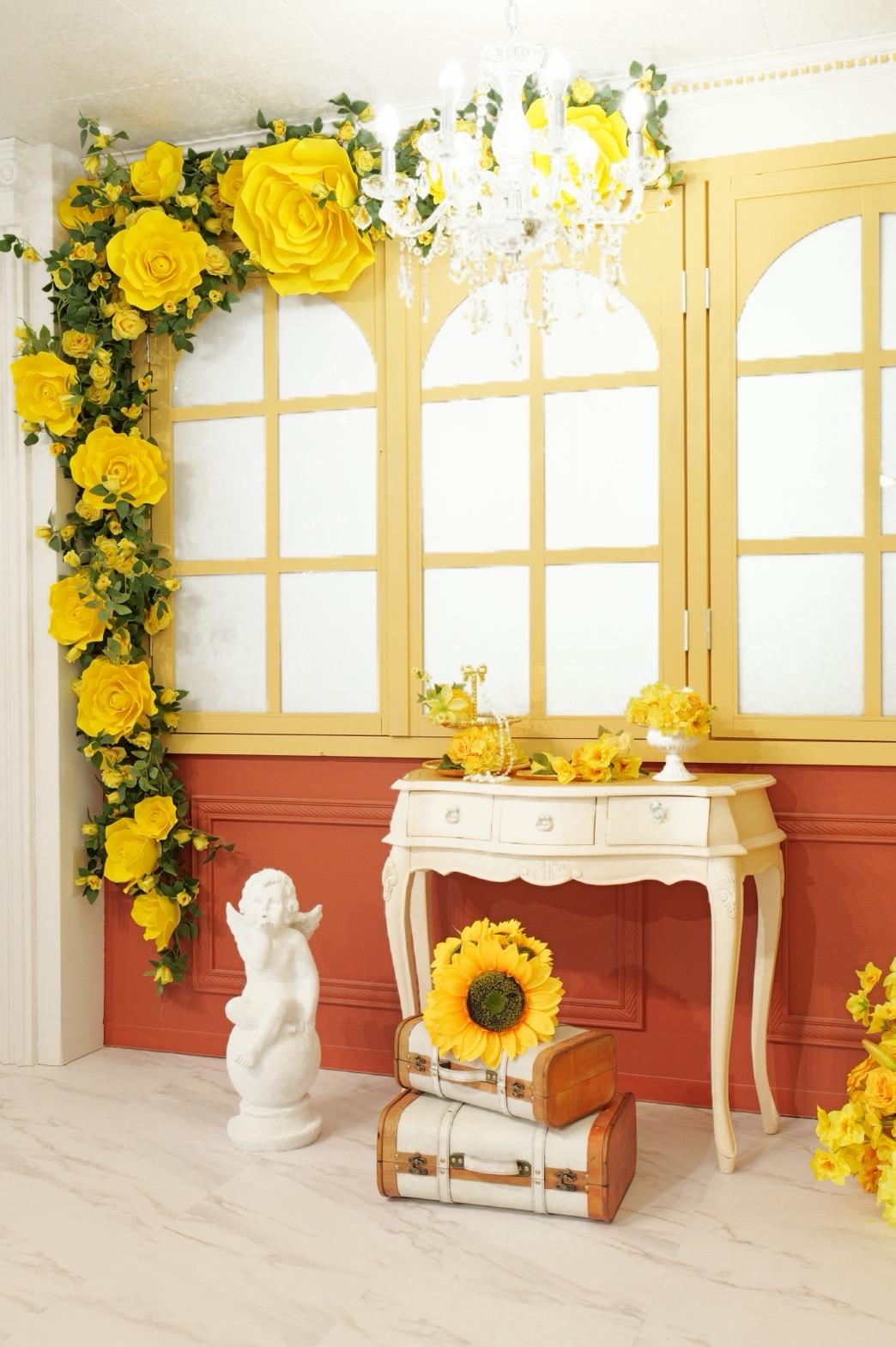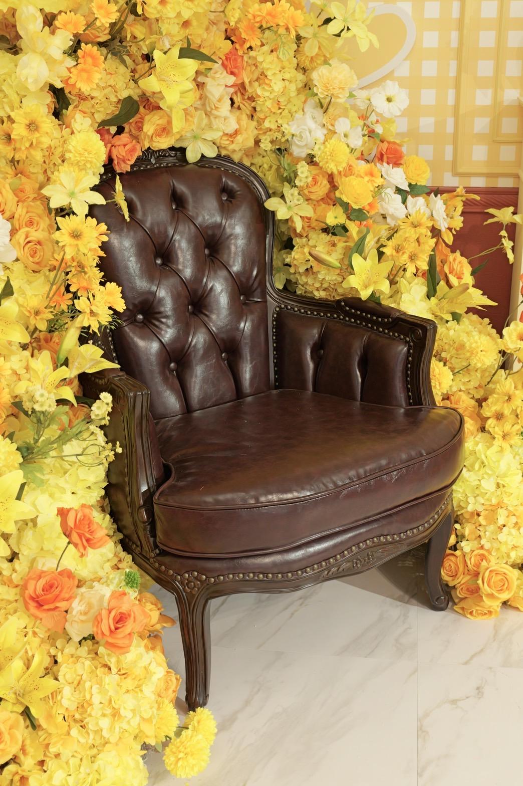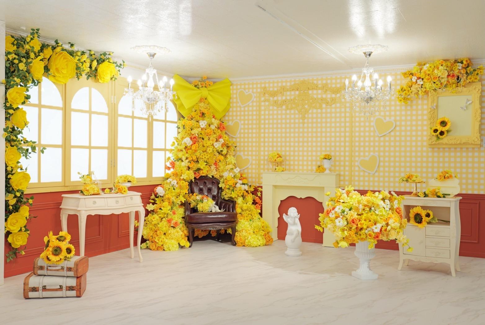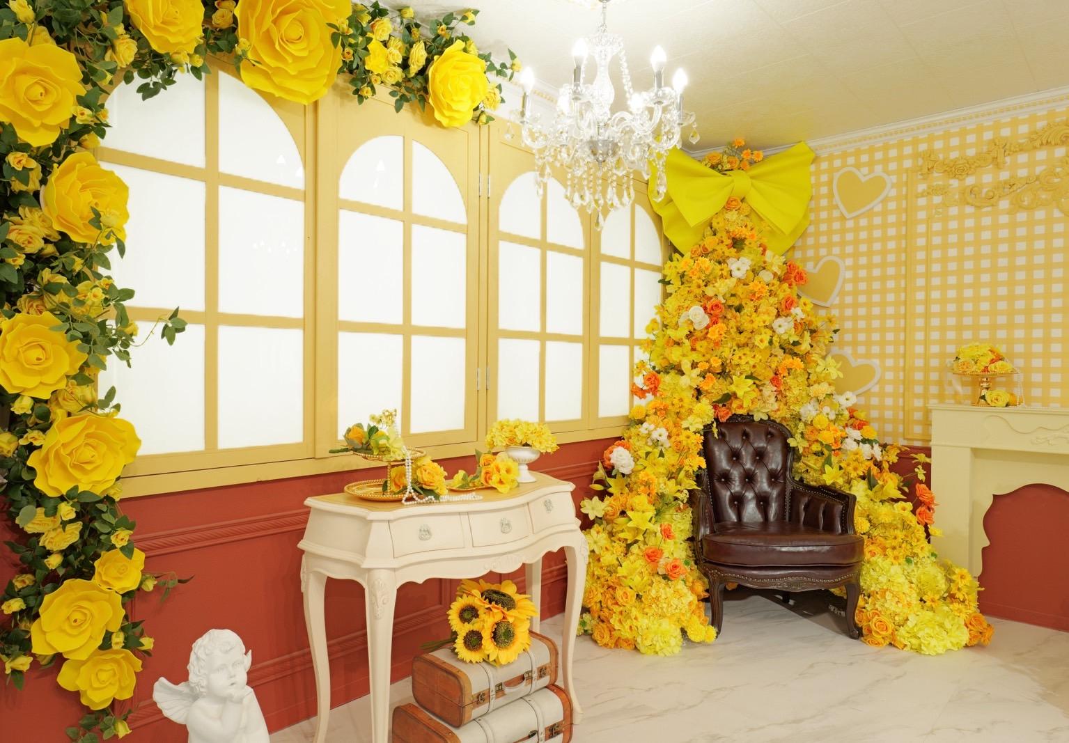 オレンジ×イエローの花々に包まれた華やかなブース。大きなリボンと豪華な花々が壁一面を飾り、存在感のあるチェアとロココ調家具が並ぶ華やかな空間です。“可愛い撮影スタジオ”を探している方にぴったり