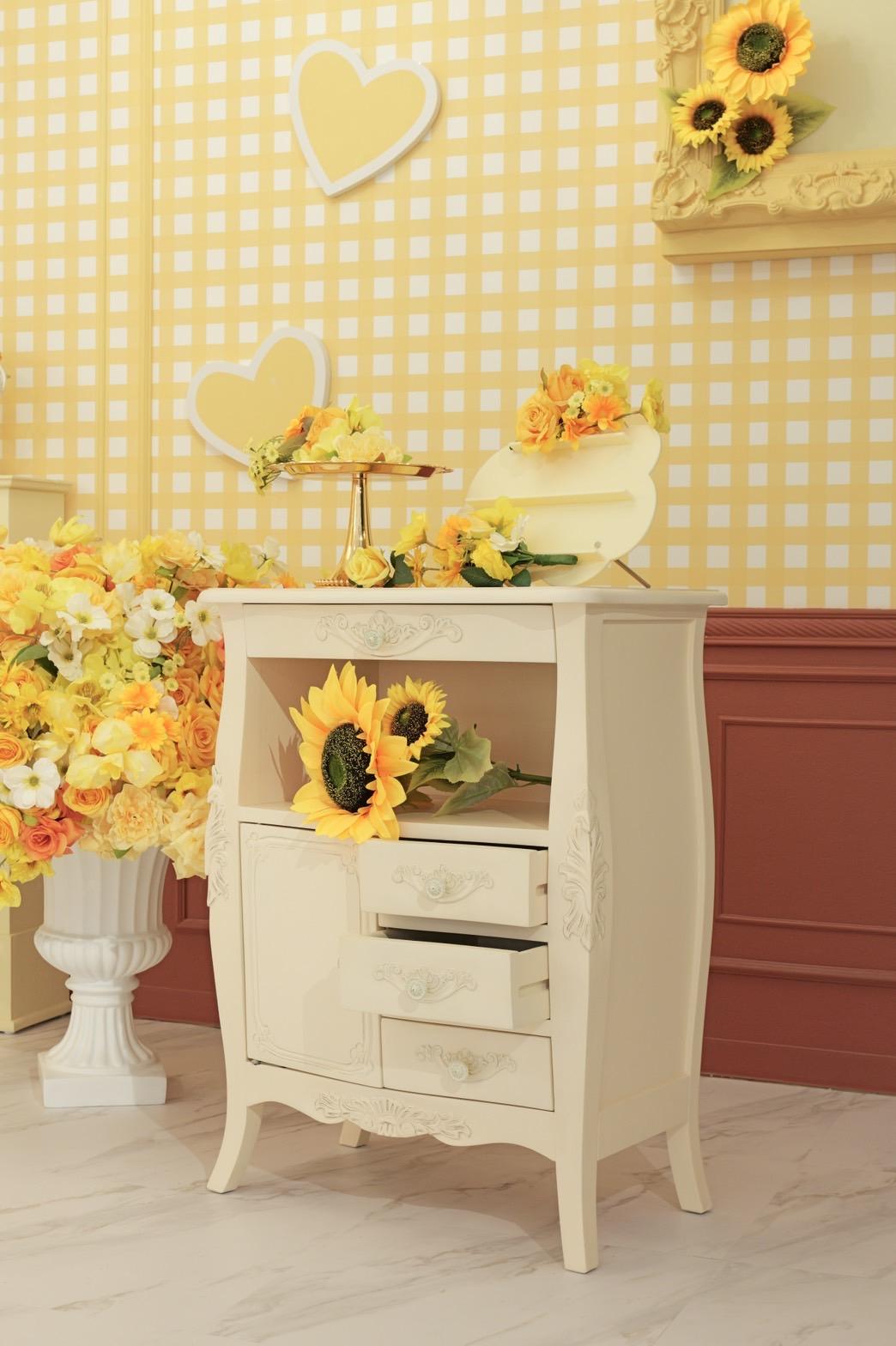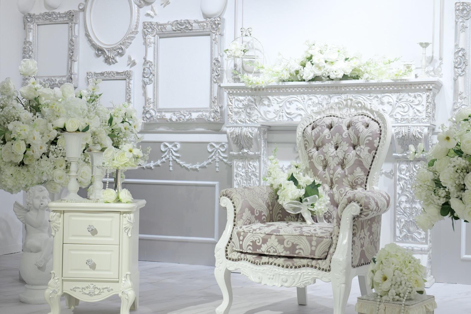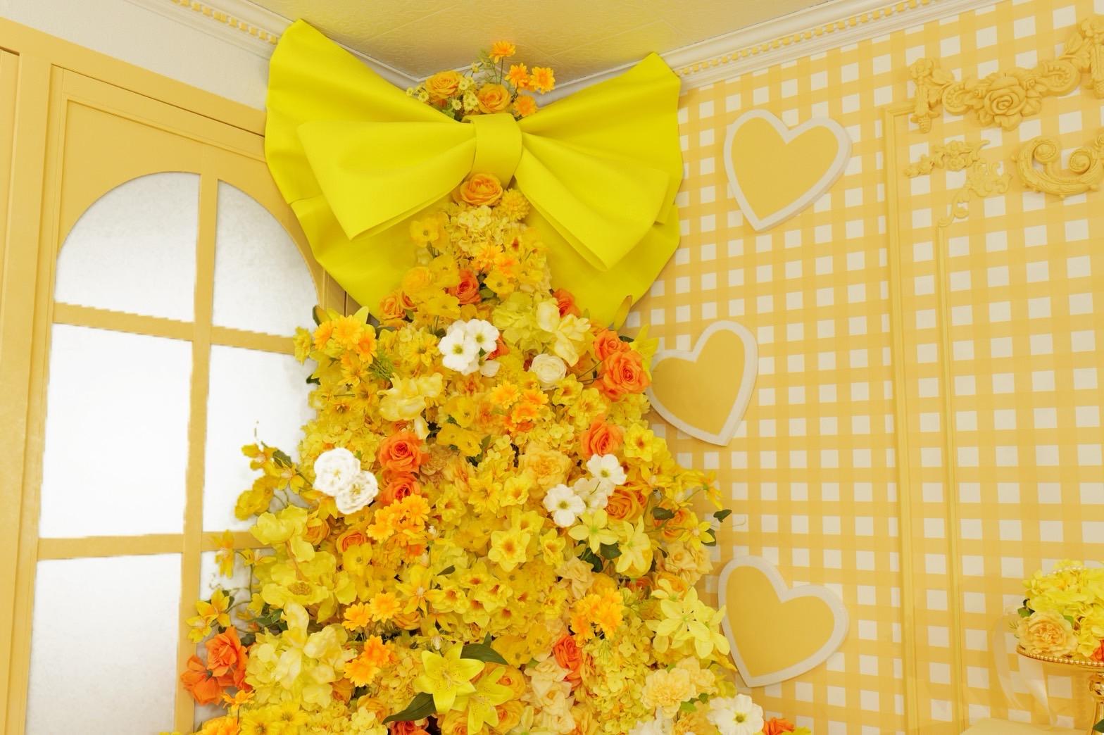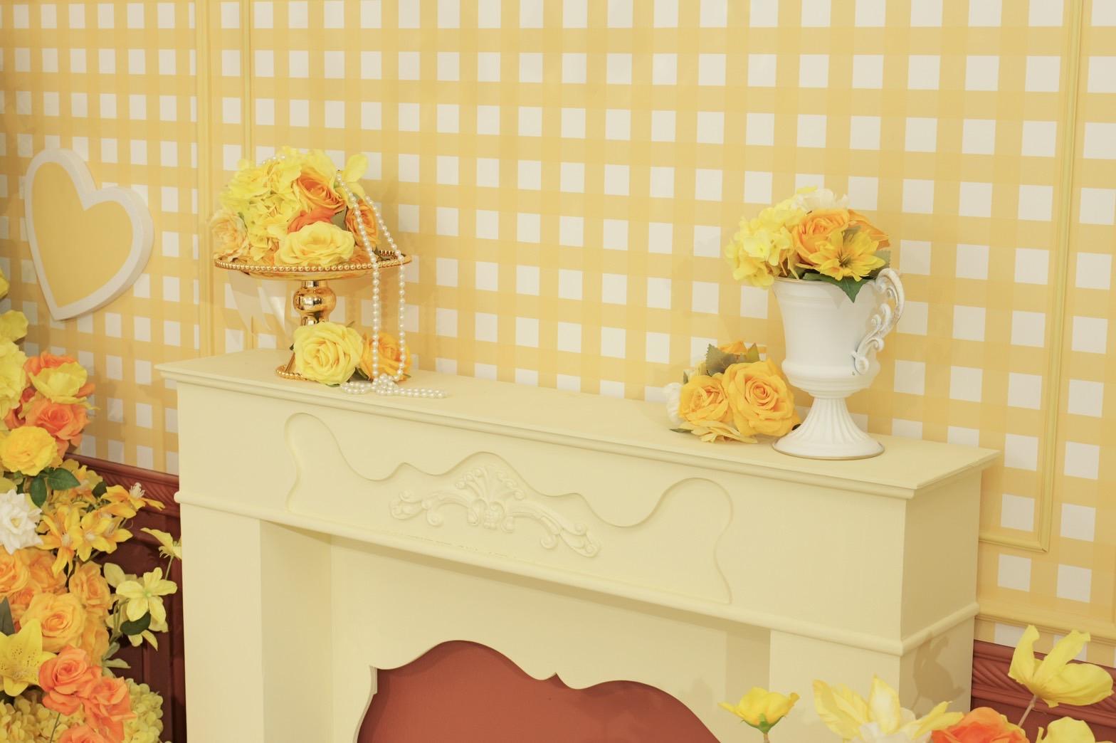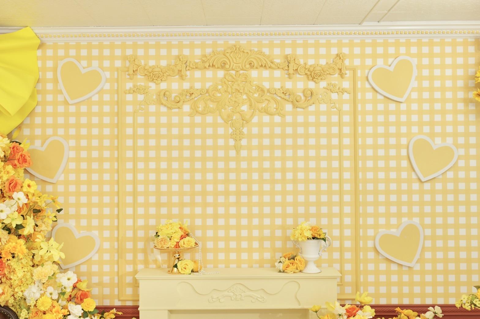 オレンジ×イエローの花々に包まれた華やかなブース。大きなリボンと豪華な花々が壁一面を飾り、存在感のあるチェアとロココ調家具が並ぶ華やかな空間です。“可愛い撮影スタジオ”を探している方にぴったり