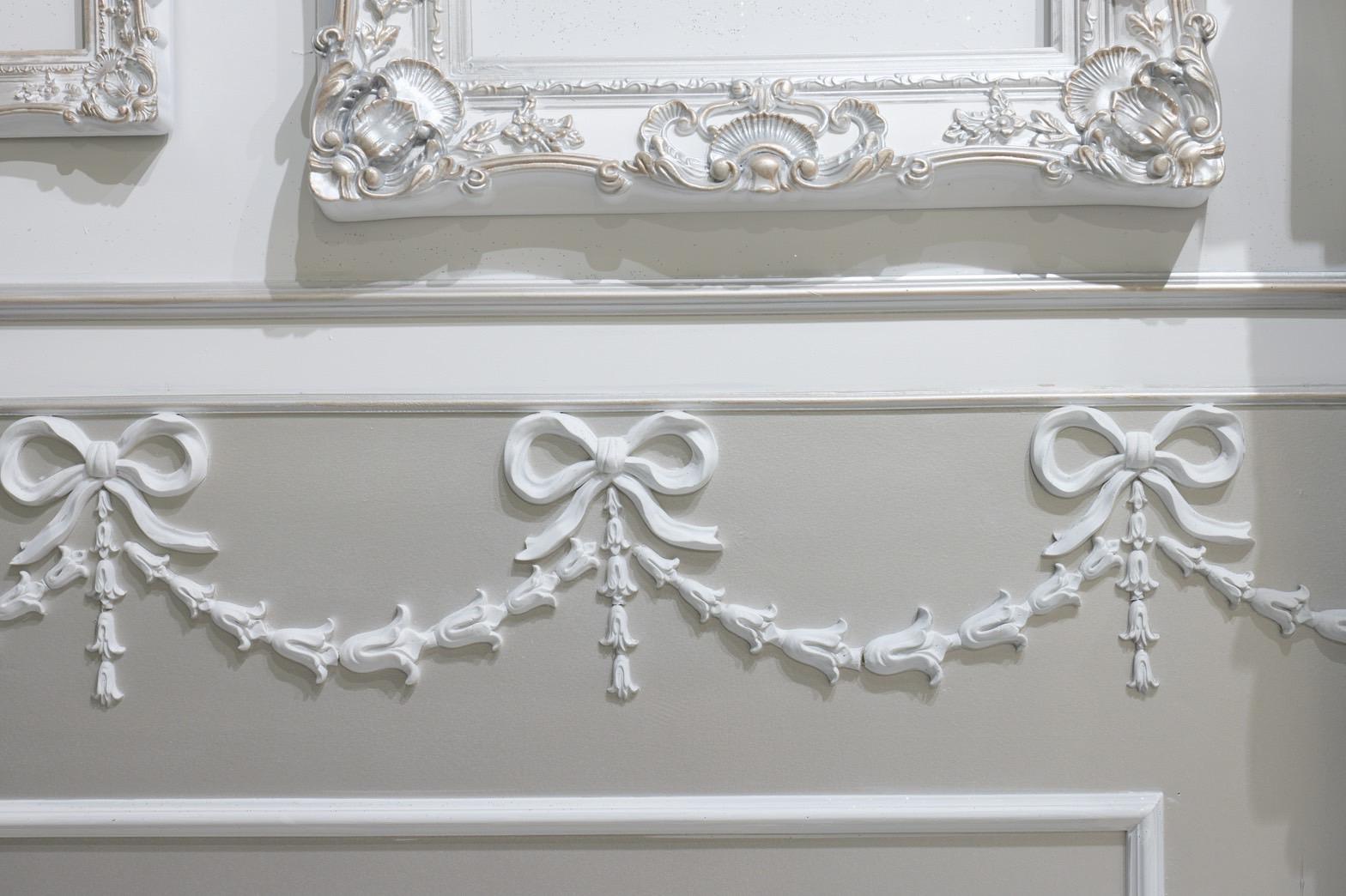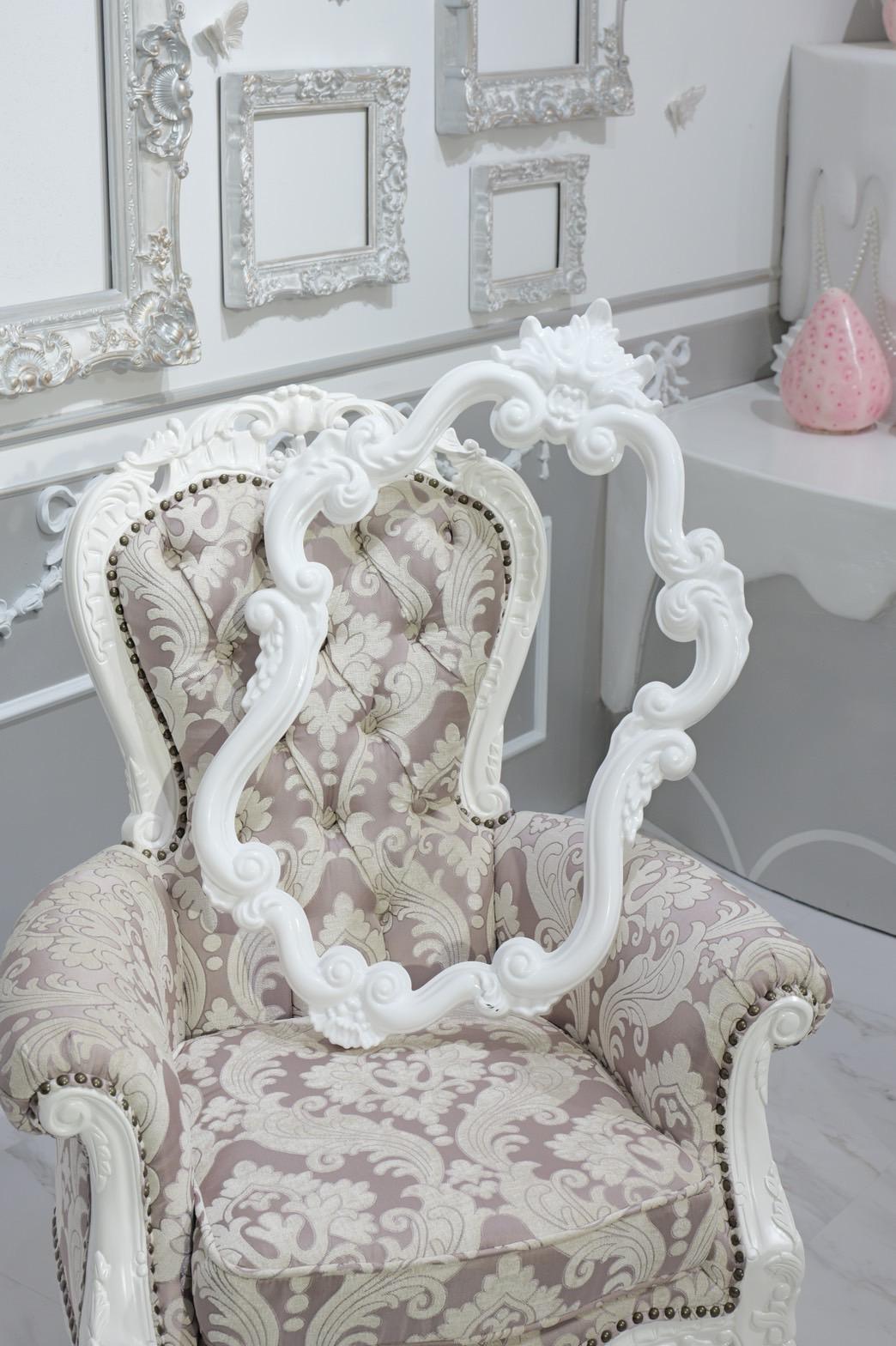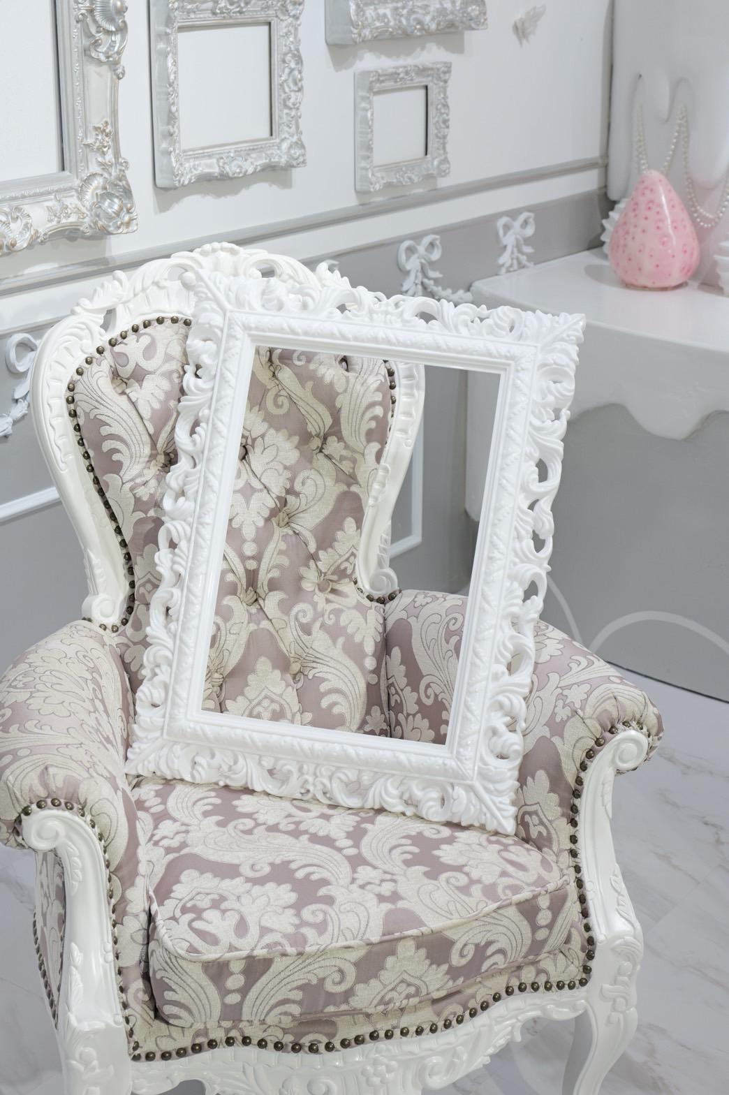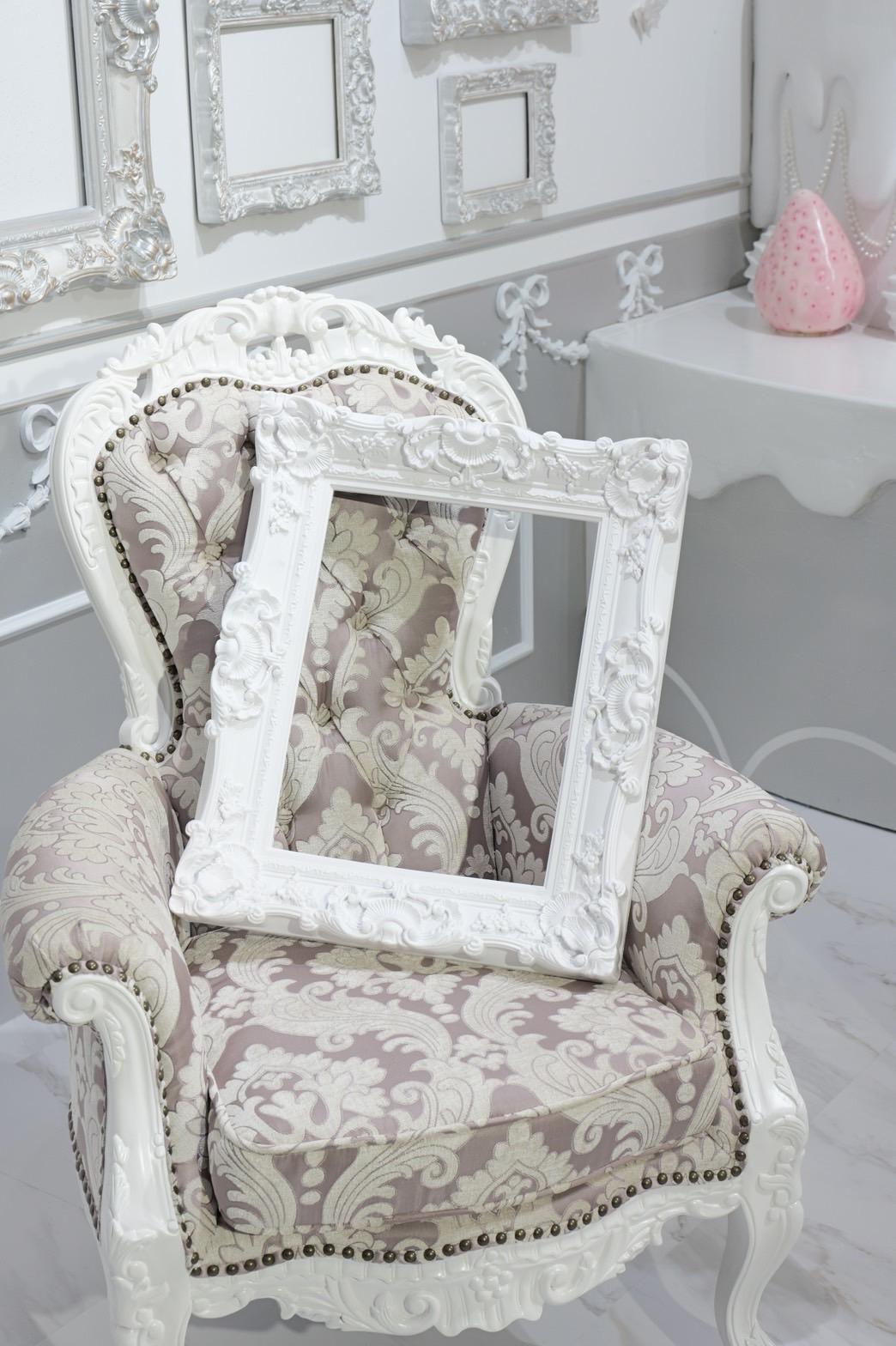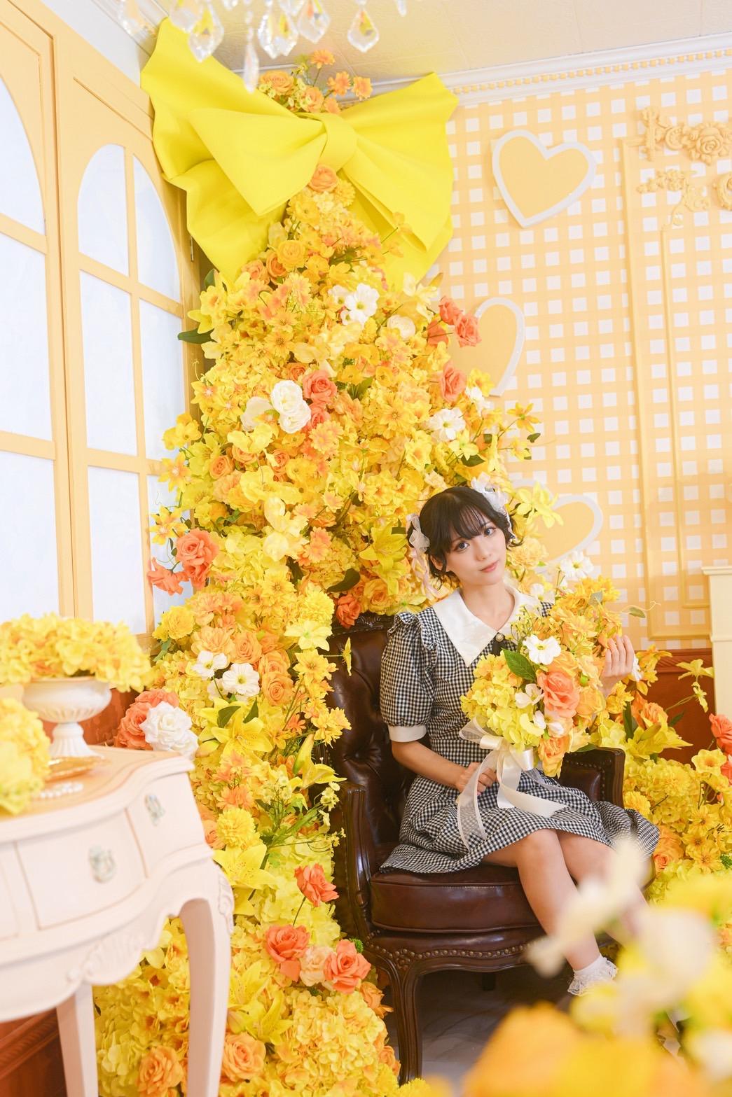 オレンジ×イエローの花々に包まれた華やかなブース。大きなリボンと豪華な花々が壁一面を飾り、存在感のあるチェアとロココ調家具が並ぶ華やかな空間です。“可愛い撮影スタジオ”を探している方にぴったり