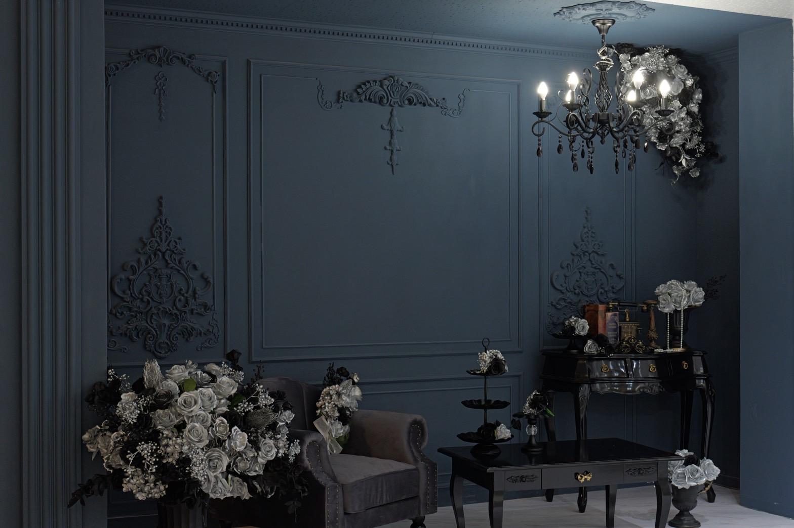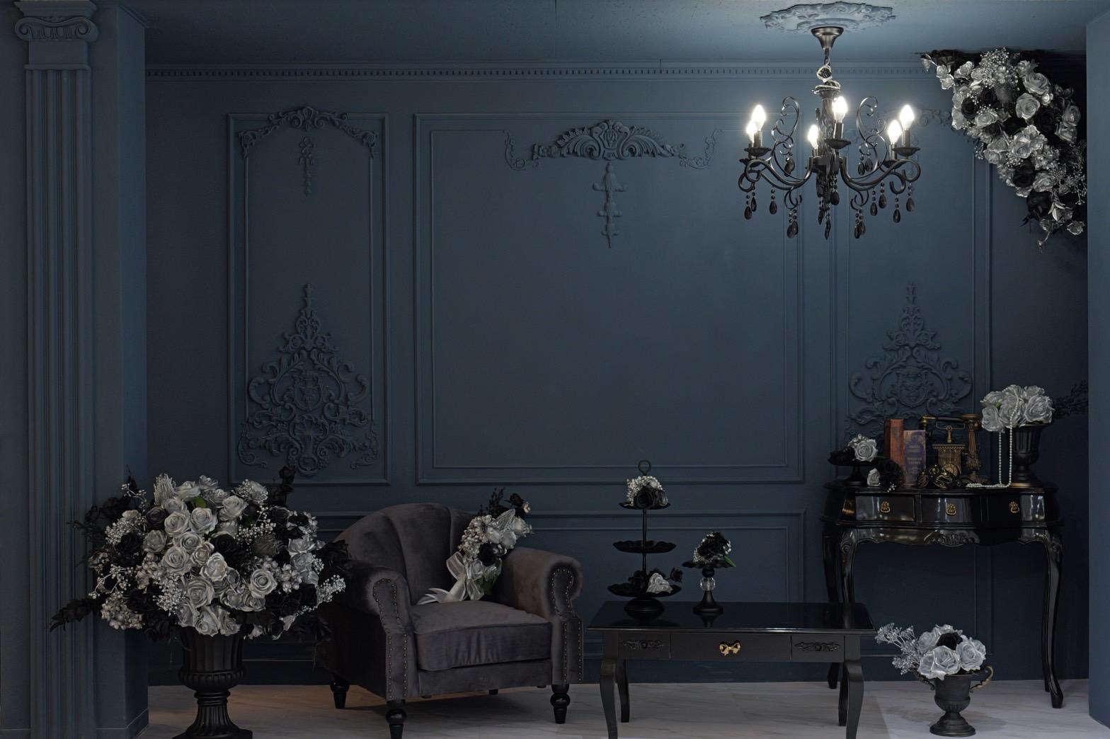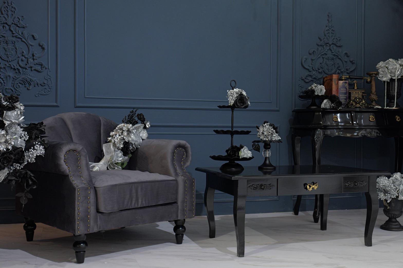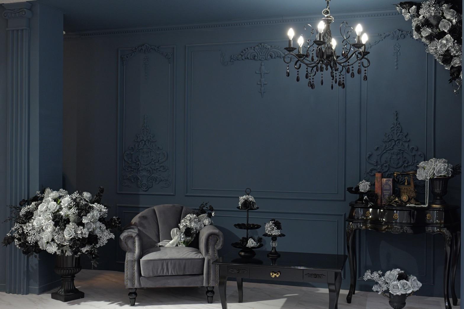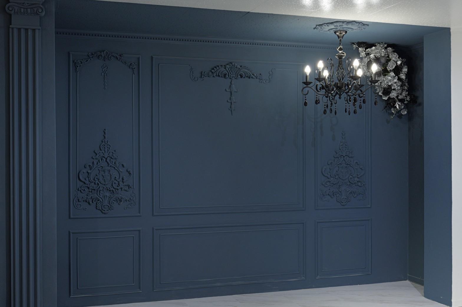 ネイビー×ブラックが織りなす、モダンクラシックな撮影空間もご用意しました♡深みのあるネイビーと艶やかなブラックを基調にしたモダン撮影スタジオ。クラシカルな装飾とアンティーク家具が調和した空間は、落ち着いた高級感と世界観のある写真を演出。“可愛い撮影スタジオ”を卒業した大人女子にも人気のエレガントで洗練されたブースです。