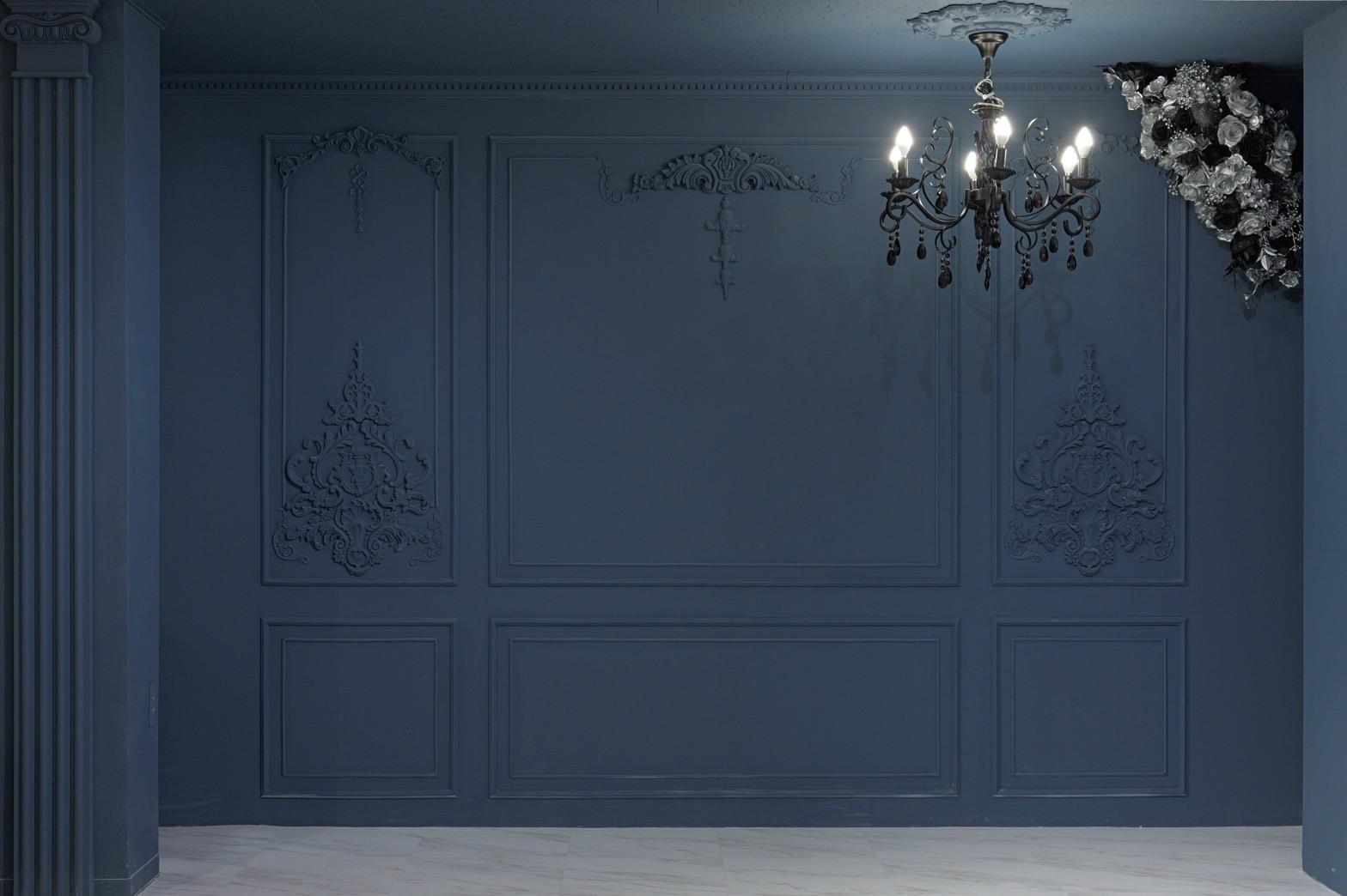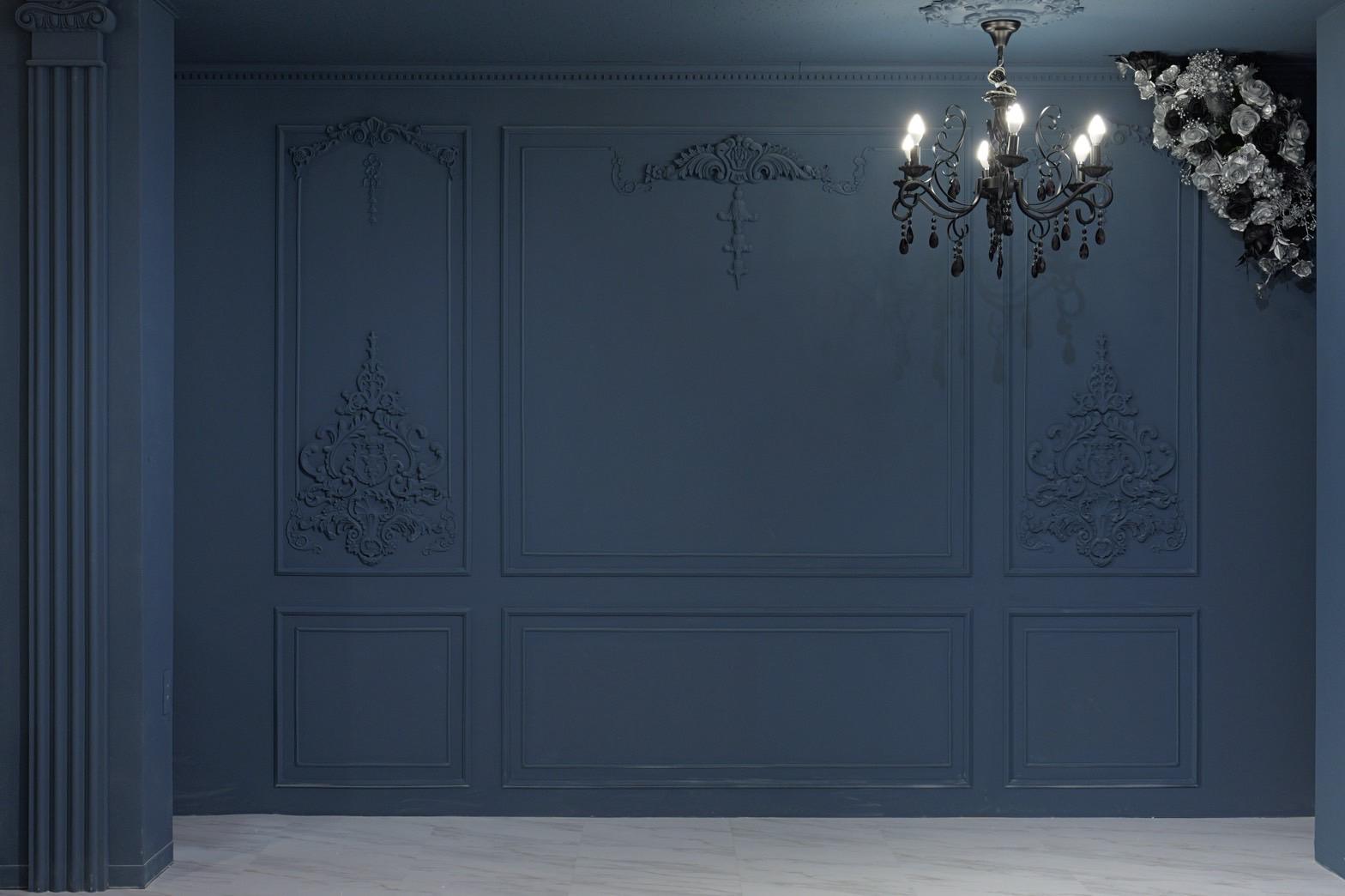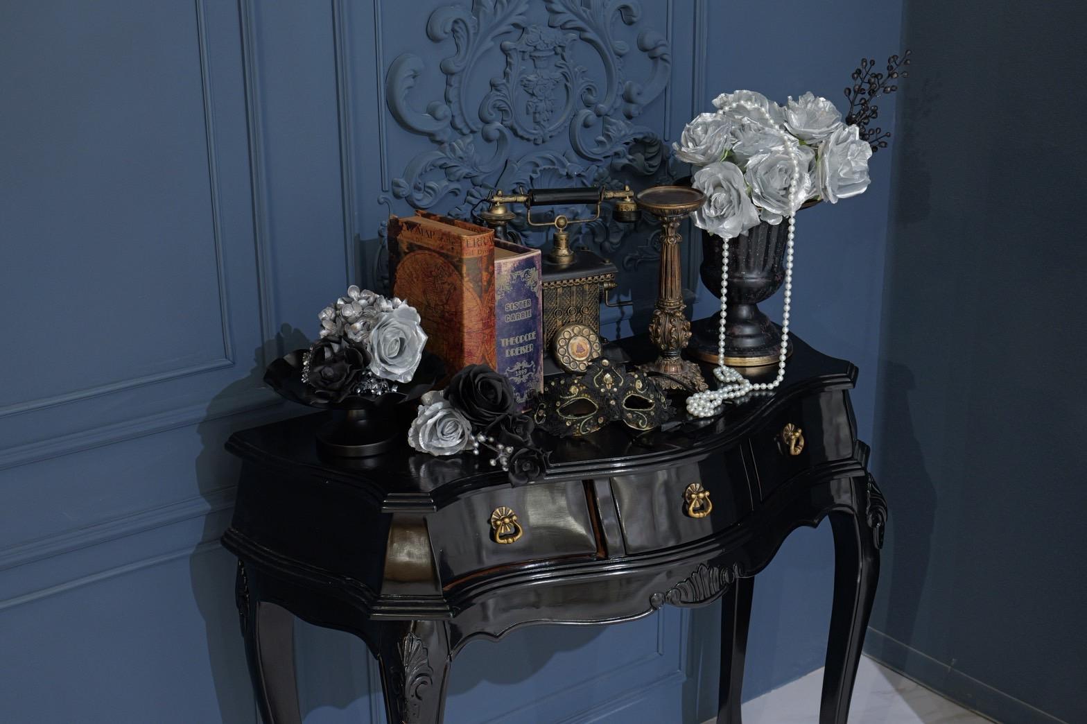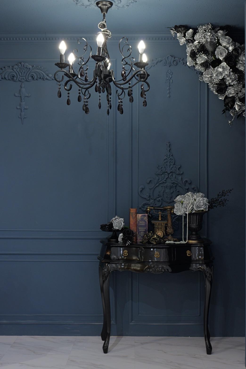 ネイビー×ブラックが織りなす、モダンクラシックな撮影空間もご用意しました♡深みのあるネイビーと艶やかなブラックを基調にしたモダン撮影スタジオ。クラシカルな装飾とアンティーク家具が調和した空間は、落ち着いた高級感と世界観のある写真を演出。“可愛い撮影スタジオ”を卒業した大人女子にも人気のエレガントで洗練されたブースです。