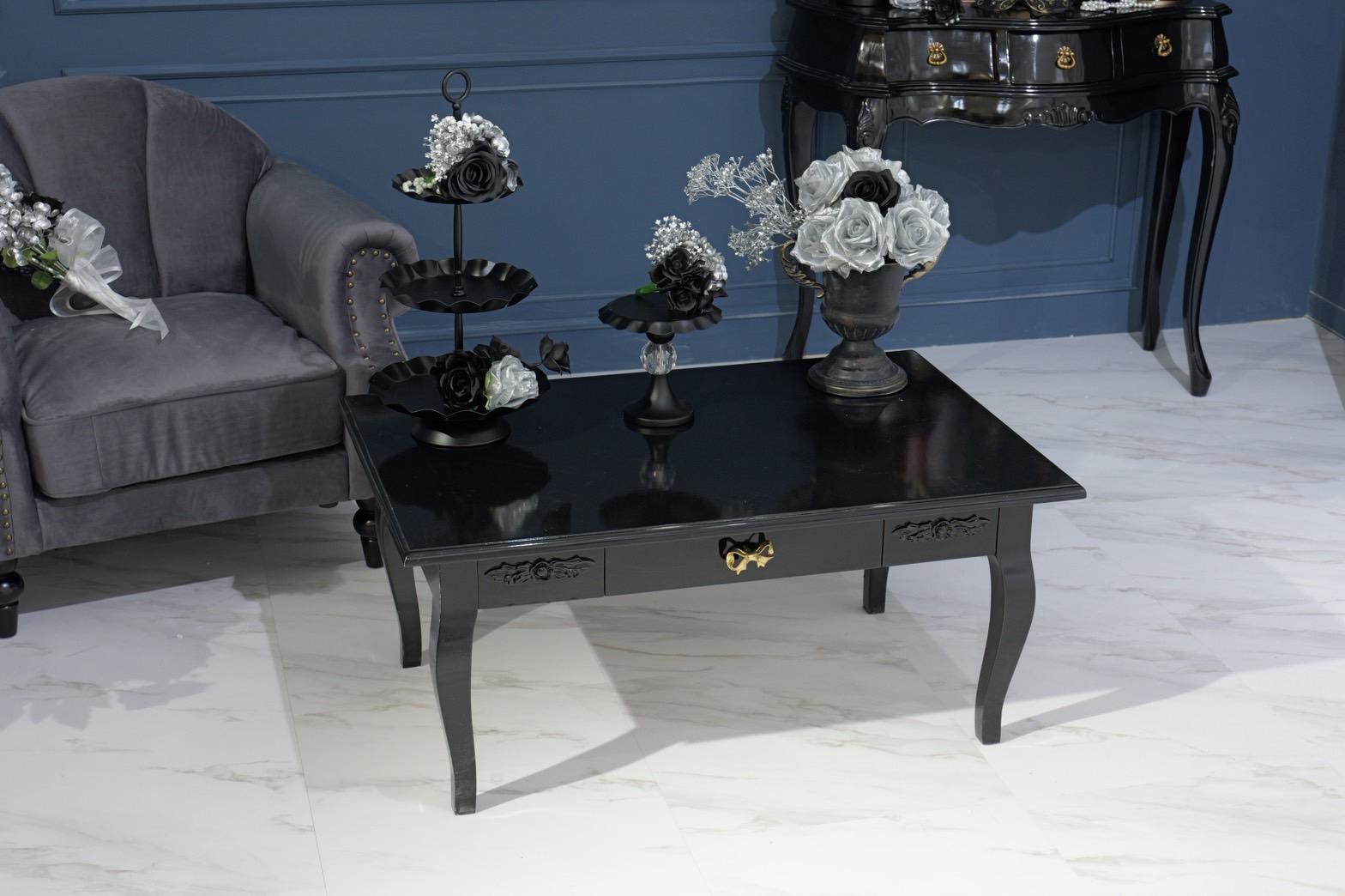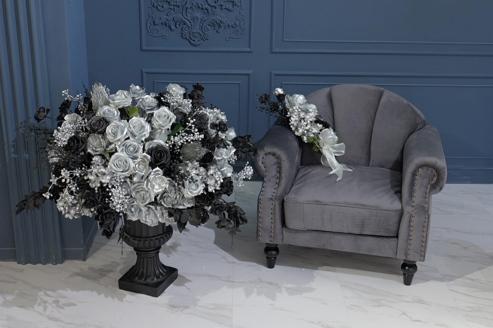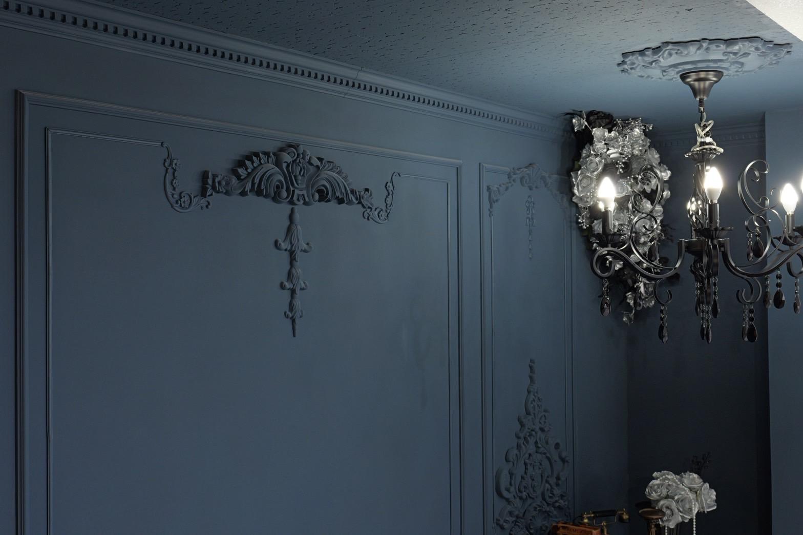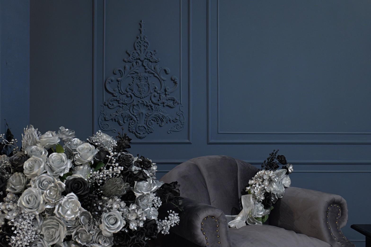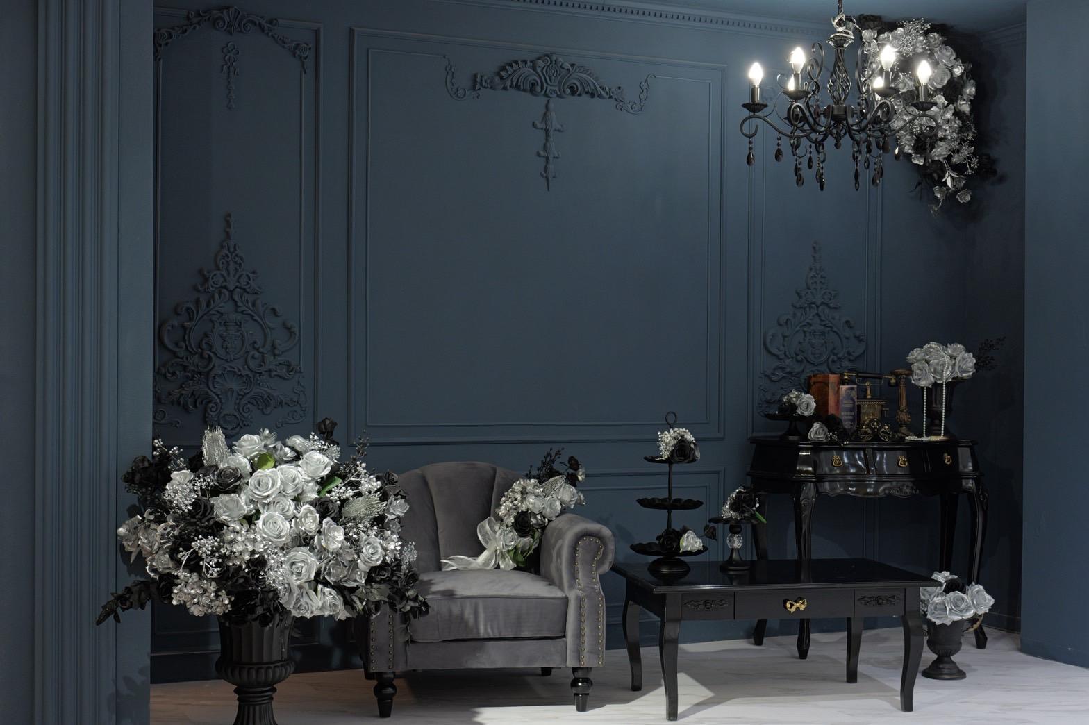 ネイビー×ブラックが織りなす、モダンクラシックな撮影空間もご用意しました♡深みのあるネイビーと艶やかなブラックを基調にしたモダン撮影スタジオ。クラシカルな装飾とアンティーク家具が調和した空間は、落ち着いた高級感と世界観のある写真を演出。“可愛い撮影スタジオ”を卒業した大人女子にも人気のエレガントで洗練されたブースです。